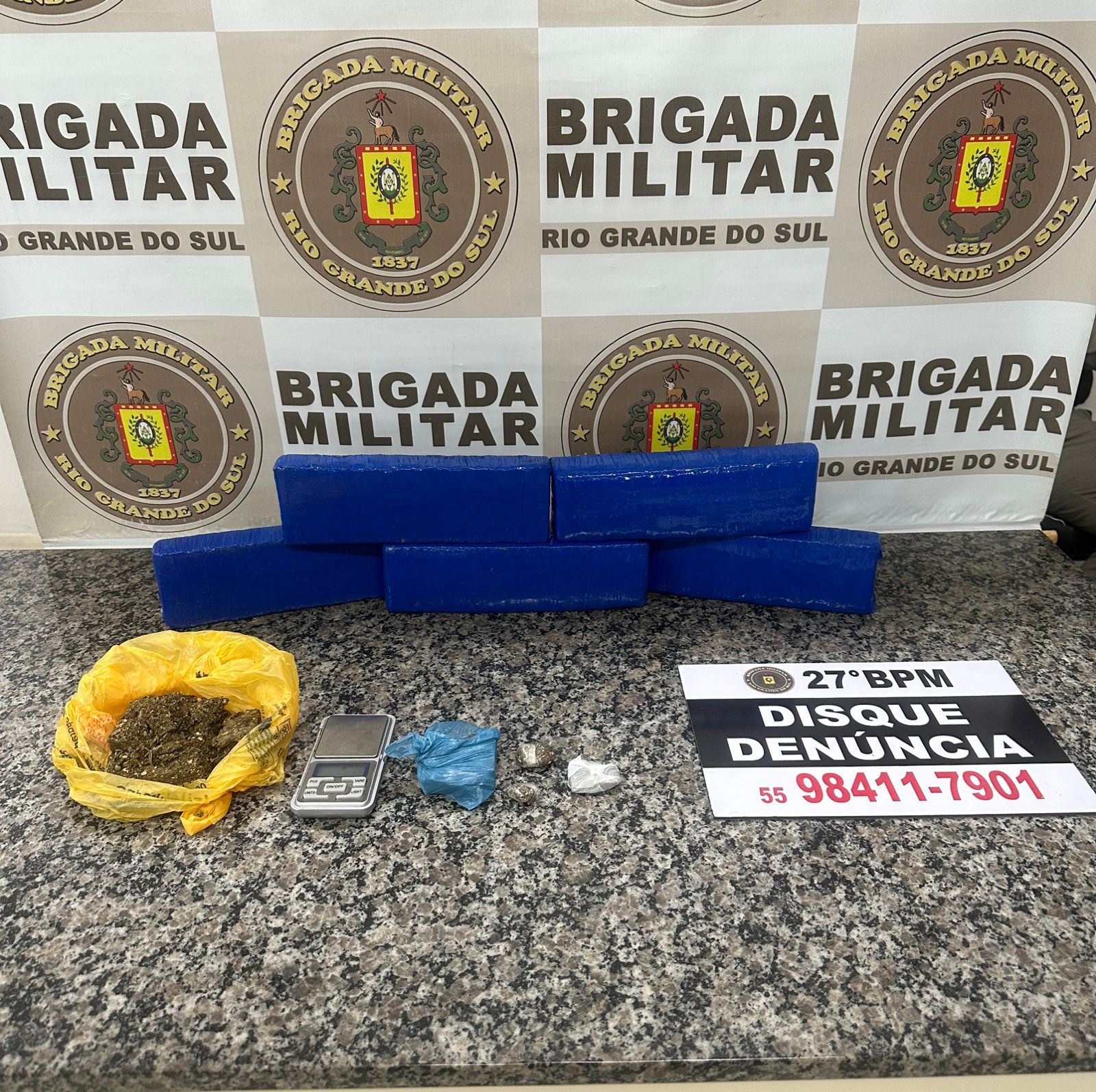 No bairro Missões, durante patrulhamento tático motorizado, foram apreendidos cinco tijolos de maconha, totalizando 3,149 quilos, além de cinco porções da mesma substância, somando 218 gramas, e uma balança de precisão.