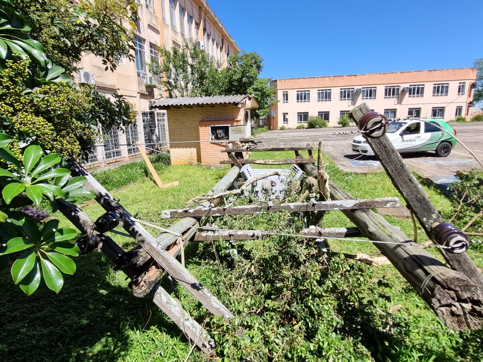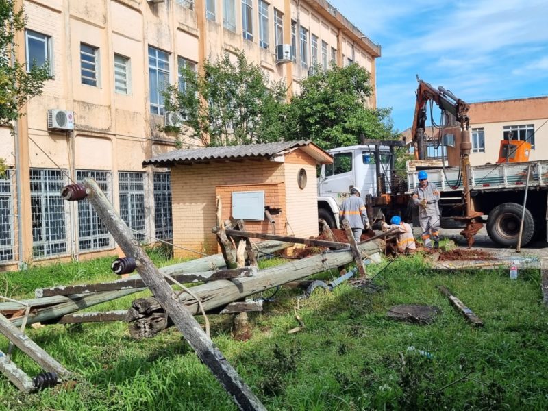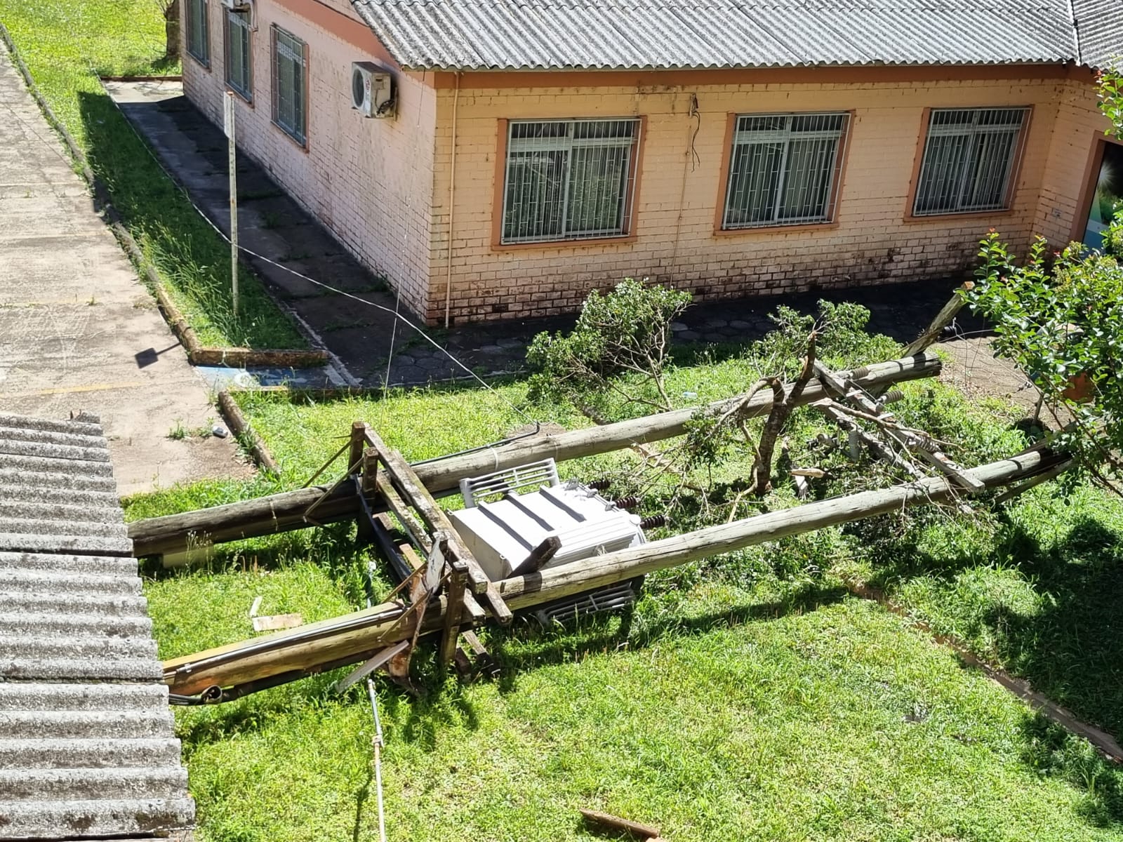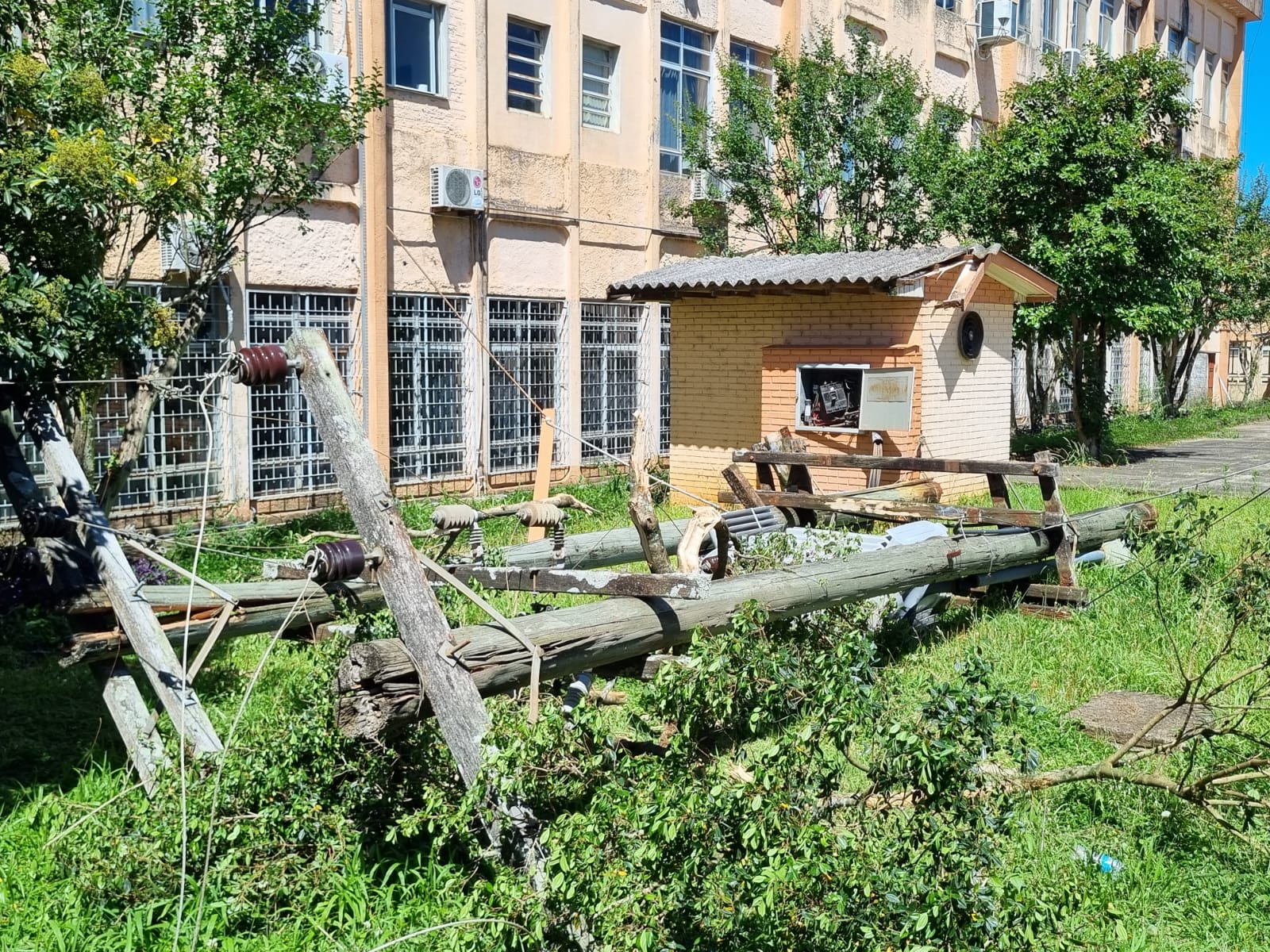 Desde a madrugada de segunda-feira (10/11), a planta de distribuição elétrica do campus da Unicruz está parcialmente interrompida devido a queda de dois postes de sustentação de um transformador, localizados atrás do prédio central, próximo a uma grande área de estacionamento. A queda se deu em consequência das fortes rajadas de vento que vieram acompanhadas do temporal que se espalhou pela região no final de semana, causando prejuízos pontuais em áreas urbanas e rurais.