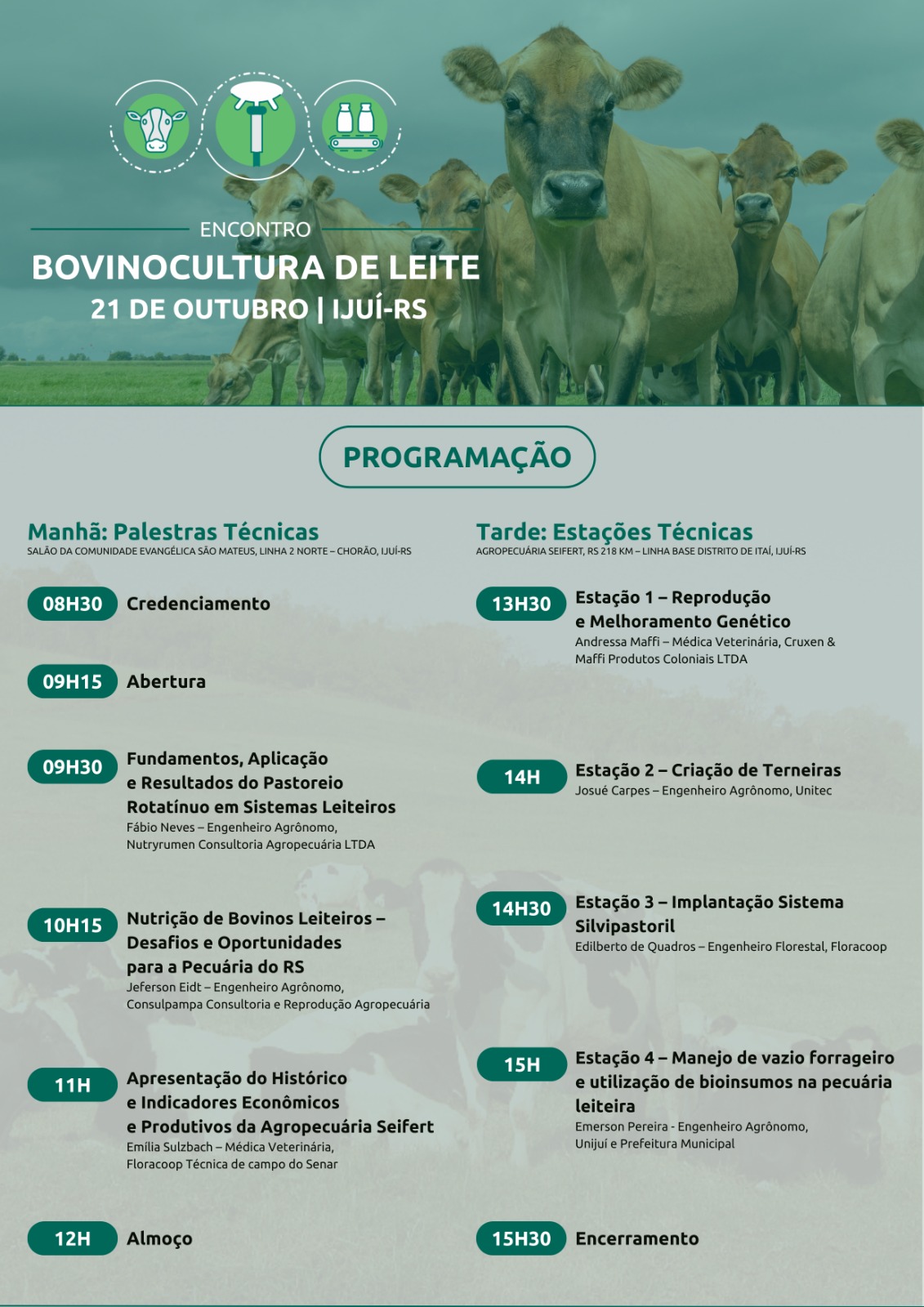 Nesta terça-feira, 21, no centro comunitário da comunidade evangélica São Mateus, da Linha 2 Norte, Ijuí, vai acontecer encontro sobre bovinocultura de leite. Não há mais inscrições. O credenciamento vai ocorrer as 8 horas e 30 minutos, com abertura às 9 e 15. A partir das 9 e 30, haverá palestras sobre pastoreio rotatinuo em sistemas leiteiros, nutrição de bovinos leiteiros, apresentação de indicadores produtivos da agropecuária Seifert, ainda estações demonstrativas referente a reprodução e melhoramento genético, criação de terneiras, implantação de sistemas silvipastoril, ainda manejo de vazio forrageiro e utilização de bioinsumos na pecuária leiteira.
