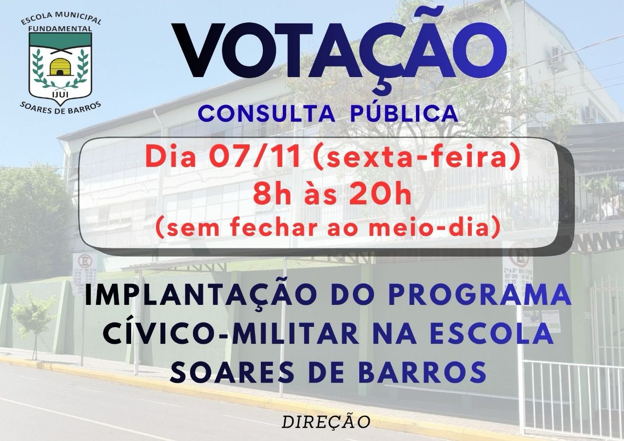 Hoje, das 8 às 20 horas, inclusive ao meio-dia, haverá votação na consulta pública sobre implantação do modelo cívico-militar na escola municipal Soares de Barros de Ijuí. A votação vai ocorrer no próprio educandário, direcionada à comunidade escolar.