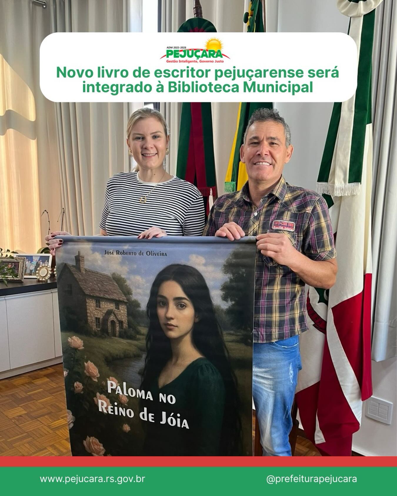 A prefeita de Pejuçara, Flaviana Brandemburg Basso, recebeu o escritor pejuçarense José Roberto de Oliveira , que realizou a entrega oficial de seu novo livro, “Paloma no Reino de Joia”. A obra será incorporada, em breve, ao acervo da Biblioteca Pública Municipal Machado de Assis, ficando disponível para toda a comunidade.