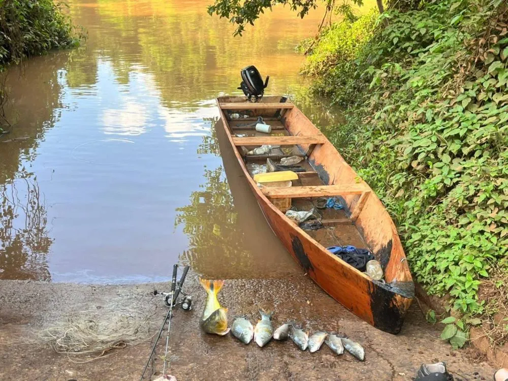 A Patrulha Ambiental da Brigada Militar flagrou ainda no sábado, 04, quatro estrangeiros realizando pesca ilegal no Rio Uruguai, dentro do Parque Estadual do Turvo, em Derrubadas, durante o período de Piracema. Os militares encontraram uma embarcação irregular com petrechos de pesca, um Dourado, sete Grumatãs, armas brancas e um carregador calibre .22 com munições. Os envolvidos foram detidos e encaminhados à Polícia Civil, com apoio da Polícia Federal. A embarcação foi destruída conforme prevê a legislação, reforçando o combate à pesca predatória.