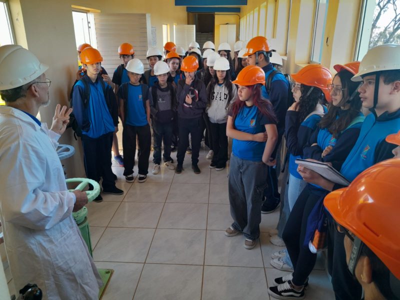 Na sequência, os alunos visitaram a Estação de Tratamento de Esgoto da Corsan, em sua primeira atividade educativa aberta ao público. No local, conheceram o caminho percorrido pelo esgoto — desde a chegada pelas tubulações ou caminhões, até o processo de tratamento e a devolução do efluente tratado ao rio. Atualmente, a ETE de Ijuí atende cerca de 30% da população urbana, tratando aproximadamente 34 litros de esgoto por segundo.