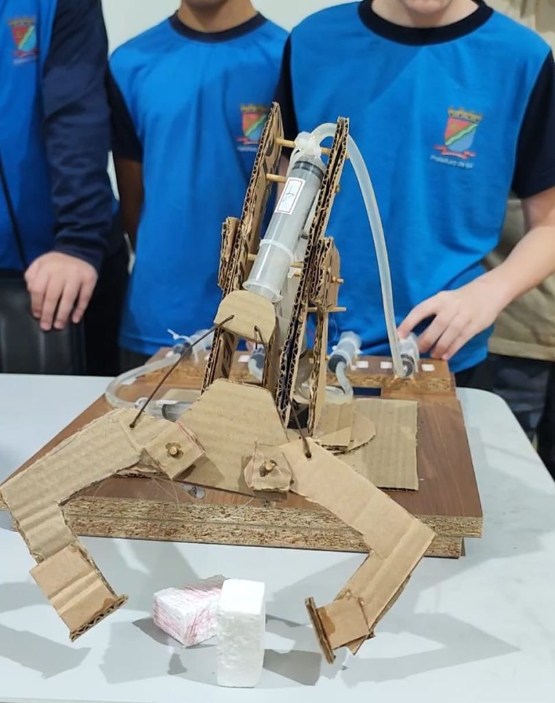 Os estudantes do 6º ano do Instituto Municipal de Ensino Assis Brasil (IMEAB) Cívico-Militar desenvolveram um projeto no componente curricular de Artes com foco na cultura maker e na sustentabilidade. A atividade foi mediada pela professora Amanda Rieger. Como proposta prática, um grupo de cinco alunos construiu uma garra hidráulica utilizando materiais como papelão, cola quente, palitos, seringas e base de madeira. A produção foi realizada tanto em sala de aula quanto em casa, integrando diferentes momentos de aprendizagem.