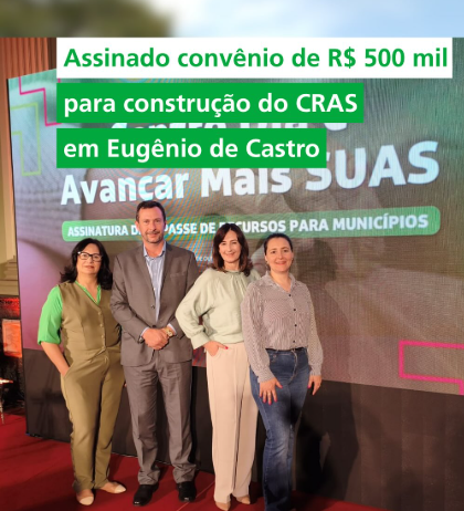 O governador Eduardo Leite assinou, ontem, convênio de R$ 500 mil para a construção do CRAS – Centro de Referência em Assistência Social – em Eugênio de Castro, juntamente com o Secretário de Desenvolvimento Social, Beto Fantinel, e Vice-Prefeito, Eduardo Bechorner. No ato esteve presente também Secretária Municipal de Saúde e Assistência Social, Maristane Bechorner, e as vereadoras Altiva Wittckind e Daiane Moura.