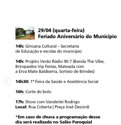 Nesta quarta-feira, 29, é feriado em Eugênio de Castro, visto transcurso dos 38 anos de emancipação. A partir das 14 horas dessa quarta-feira, na praça José Dezordi, haverá gincana cultural, brinquedos para as crianças, mateada, sorteio de brindes, ainda primeira feira da saúde e assistência social. As 16 horas vai ter corte do bolo de aniversário e, 17 horas, show com Vanderlei Rodrigo.