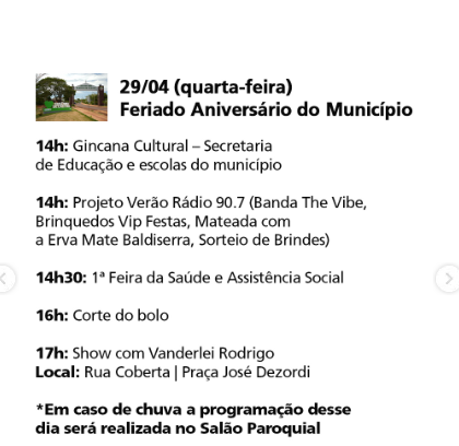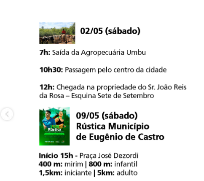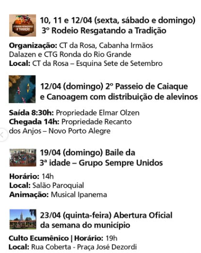 O município de Eugênio de Castro realiza programação de aniversário. As atividades começaram ontem e seguem até 9 de maio. Dia 29 deste mês, Eugênio de Castro vai completar 38 anos de emancipação. Até amanhã acontece o 3º Rodeio Resgatando a Tradição, no Centro de Tradições da Rosa, localidade de Esquina Sete de Setembro. E também amanhã, haverá o 2º Passeio de Caiaque e Canoagem, com distribuição de alevinos. A saída vai ser as 8 horas e 30 minutos, na propriedade de Elmar Olzen, e chegada as 14 horas na propriedade Recanto dos Anjos, comunidade de Novo Porto Alegre.