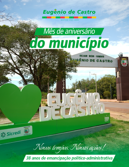 O município de Eugênio de Castro vai completar 38 anos de emancipação no próximo dia 29. Para comemorar o aniversário, a prefeitura realiza programação desde os últimos dias, com término dia 9 de maio. Domingo, 19, haverá baile da 3ª idade, promovido pelo grupo Sempre Unidos, as 14 horas, no salão paroquial da cidade, com animação do Musical Ipanema.