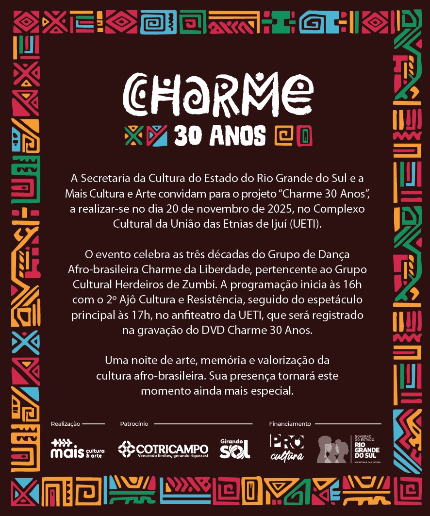 Numa iniciativa da secretaria da Cultura do Rio Grande do Sul e da Mais Cultura Arte, hoje vai ser realizado, em Ijuí, o projeto Charme 30 anos. O evento vai acontecer na sede da Ueti – União das Etnias de Ijuí, com início as 16 horas, aberto a todo público. A programação visa marcar a passagem do Dia da Consciência Negra e também vai celebrar os 30 anos do grupo de dança afro-brasileira Charme da Liberdade, pertencente ao Grupo Cultural Herdeiros de Zumbi, de Ijuí. Inicialmente haverá o 2º Ajô Cultura e Resistência, seguido do espetáculo principal, as 17 horas, no anfiteatro da Ueti, que vai ser registrado na gravação do DVD Charme 30 Anos.