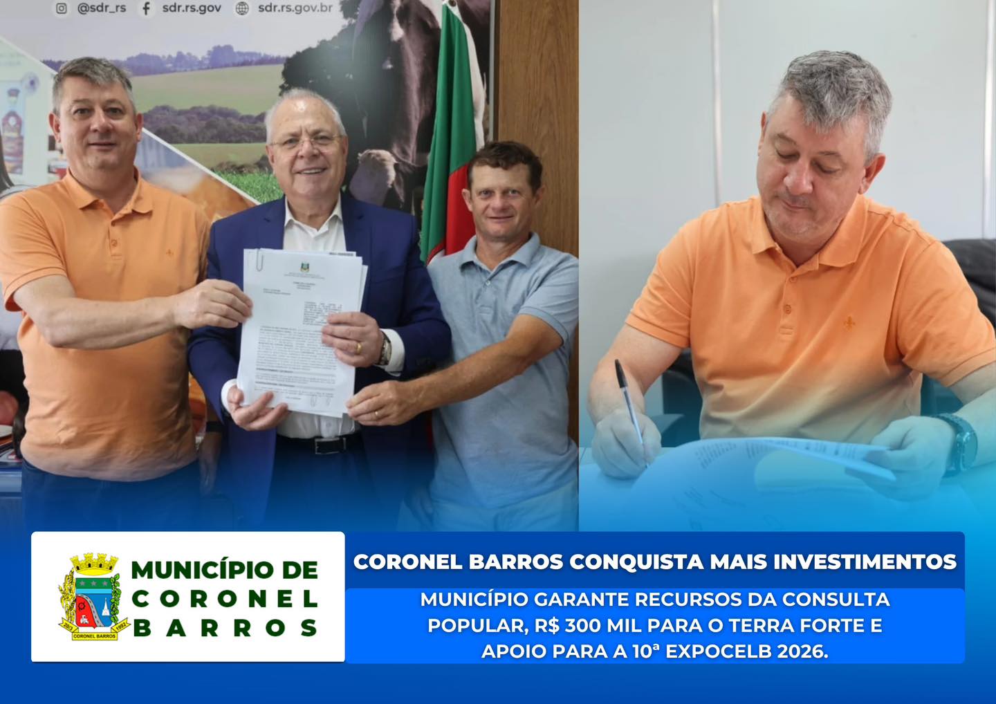 Além das assinaturas, o bom relacionamento institucional com o secretário Covatti assegurou novos avanços para Coronel Barros. Durante a agenda, foi confirmada a destinação de R$ 300.000,00 para o Programa Terra Forte, beneficiando 10 famílias e fortalecendo iniciativas de desenvolvimento rural. Também foi garantido o repasse de R$ 80 mil para apoiar a realização da 10ª Expocelb 2026, evento que movimenta a economia e valoriza a cultura local.