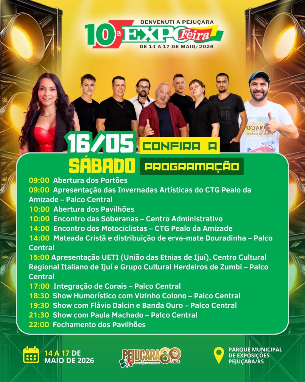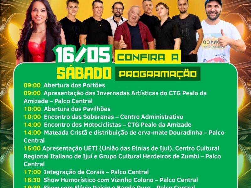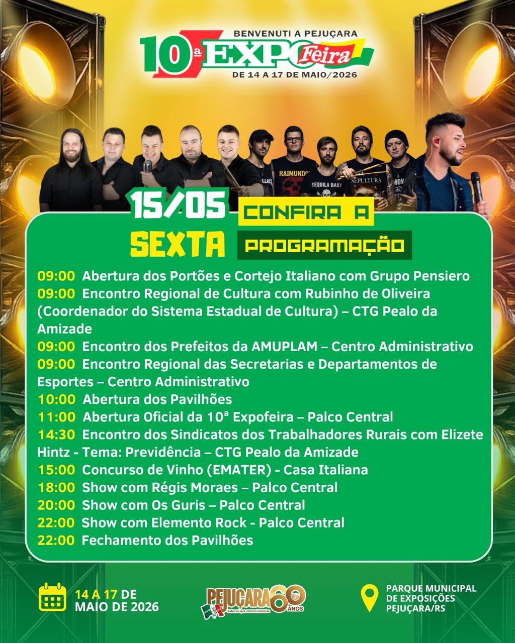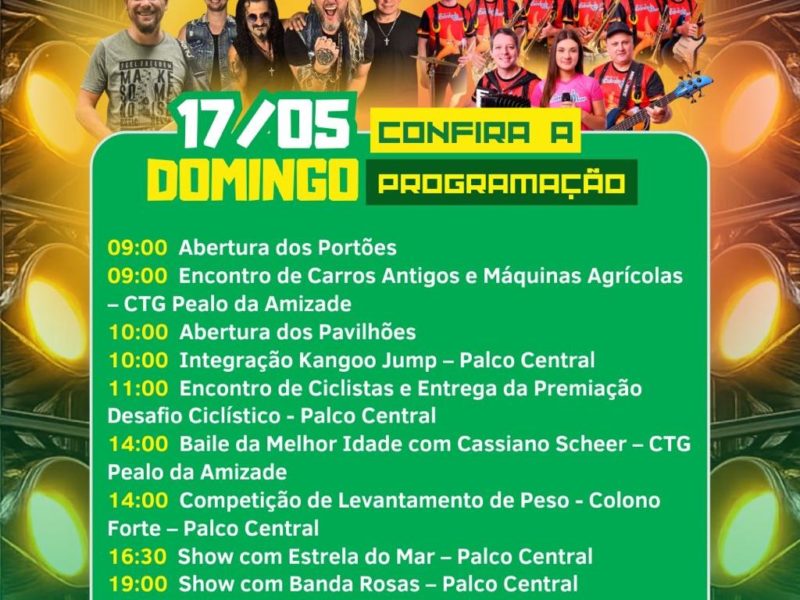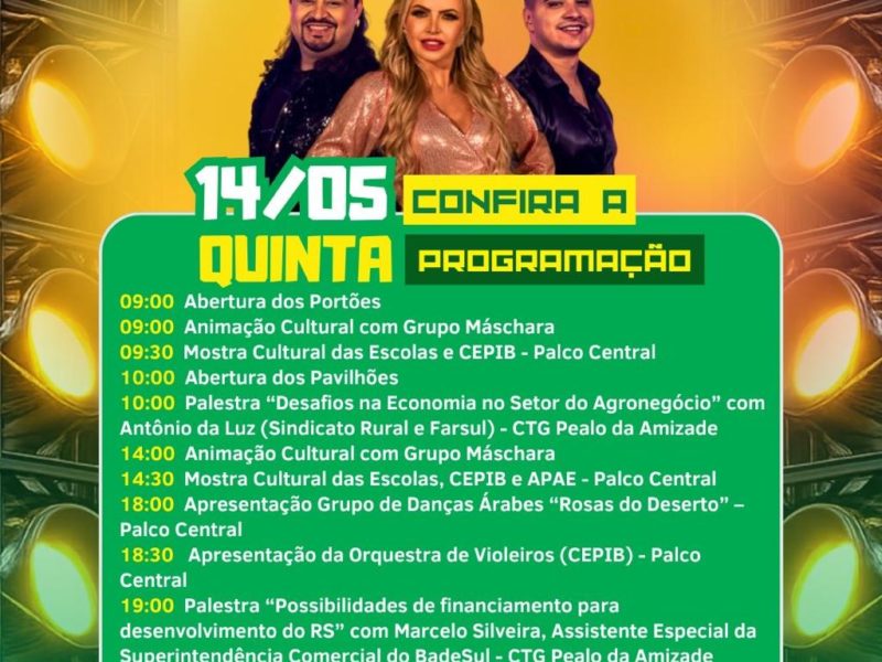 A programação inclui ainda exposições, palestras, encontros técnicos, apresentações culturais e espaços voltados à agricultura familiar. As inscrições para o Pavilhão da Agricultura Familiar seguem abertas até o dia 24 de abril, junto aos escritórios municipais da Emater.