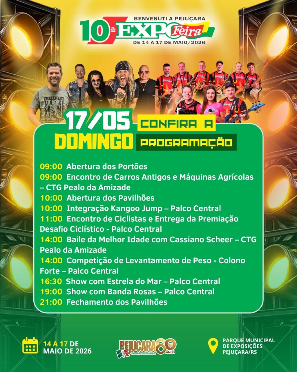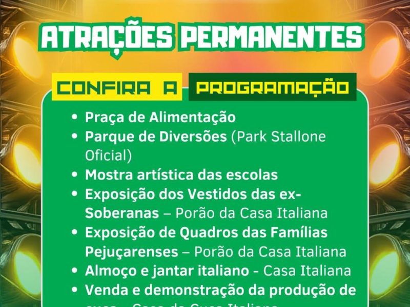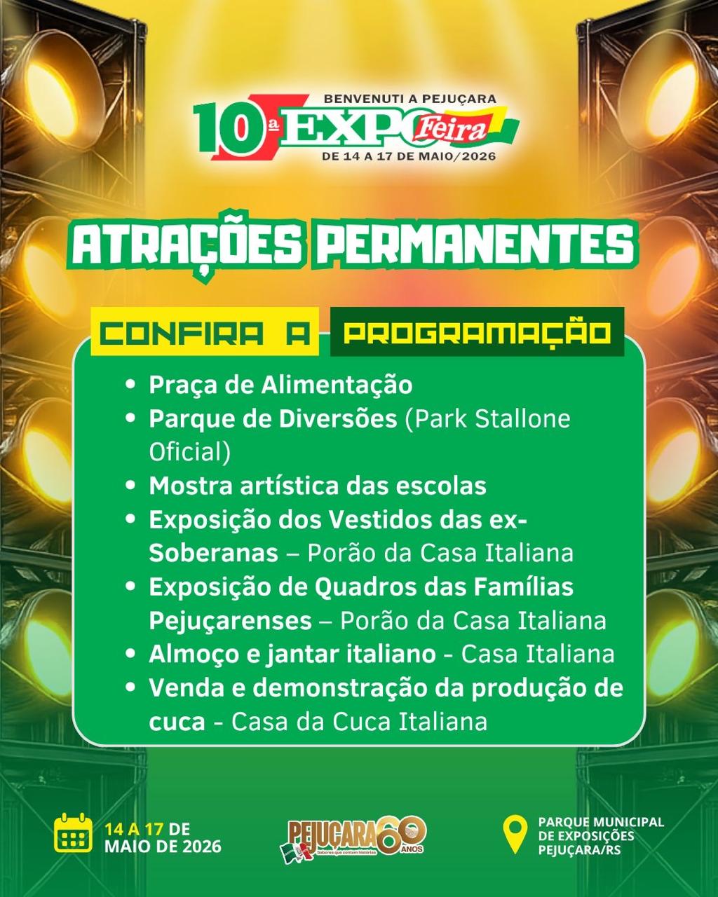 A 10ª Expofeira também contará com praça de alimentação, parque de diversões e atividades permanentes durante todos os dias de evento. A expectativa da organização é reunir público de Pejuçara e de toda a região ao longo dos quatro dias de programação.