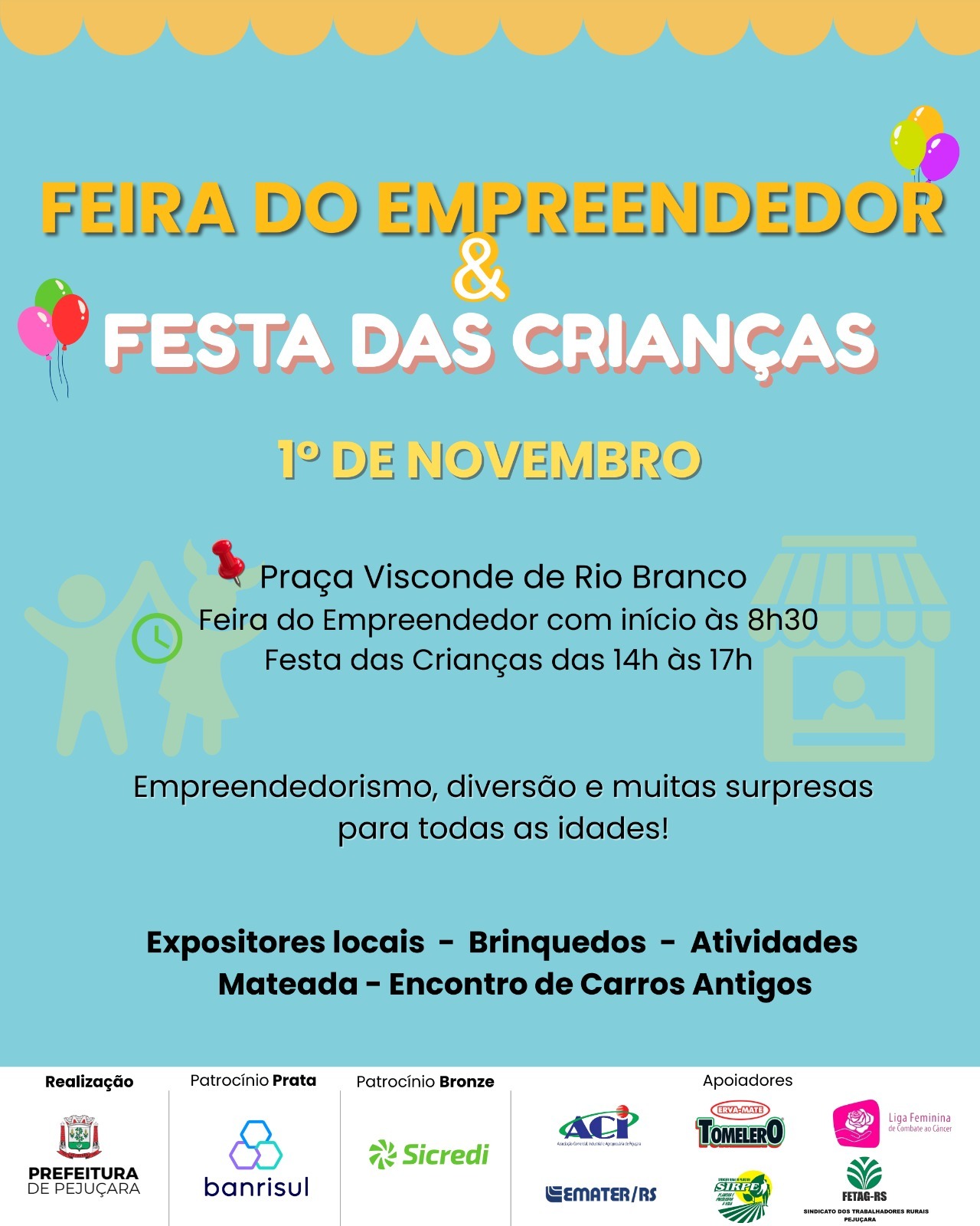 Nesta manhã também vai ter o Espaço Saúde. Já das 14 às 17 horas, também deste sábado, juntamente com a Feira do Empreendedor de Pejuçara, vai ter a Caravana da Alegria, com shows teatrais, personagens, brinquedos infláveis e espaço kids, inclusive distribuição de doces e pipoca.