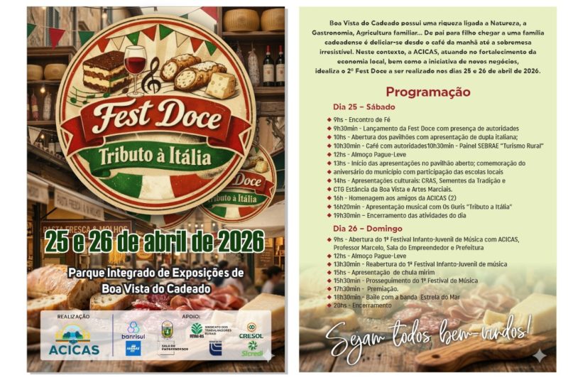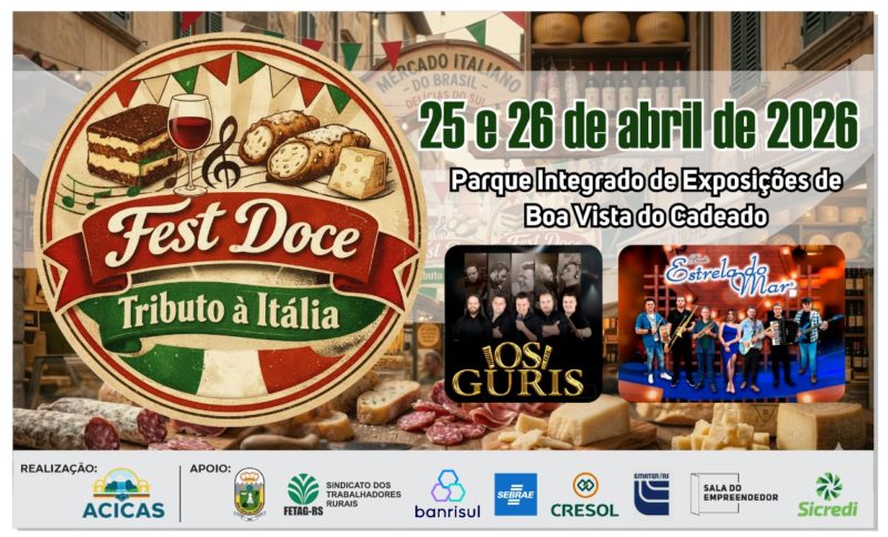 Como parte da programação dos 30 anos de Boa Vista do Cadeado, transcorridos quinta-feira, no próximo final de semana, dias 25 e 26, vai ser realizado o 2º Fest Doce, iniciativa da Acicas – Associação Cadeadense da Indústria, Comércio, Agropecuária e Serviços, com apoio da prefeitura.