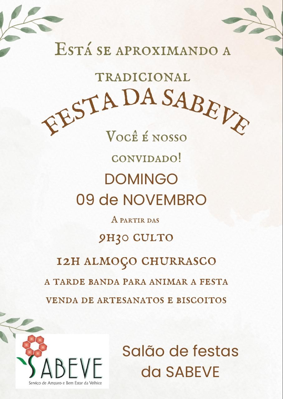 Neste domingo, 09, vai acontecer a Festa da Sabeve de Ijuí – Serviço de Amparo e Bem Estar da Velhice. A programação vai começar as 9 horas e 30 minutos com culto campal, na própria sede da entidade, Linha 2 Oeste. Após, haverá festejos durante todo o dia, com animação da Família Boranga. Vai ocorrer venda de churrasco e sobrecoxa de frango, ainda comercialização de cucas, saladas, bebidas, cachorro quente, dentre outros produtos.