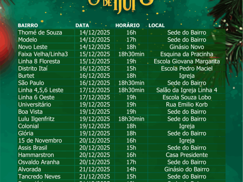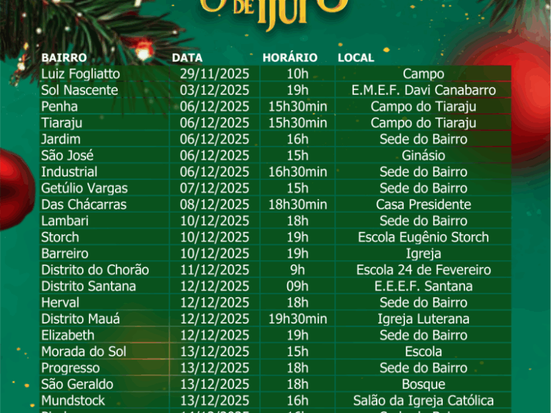 O primeiro encontro vai ocorrer, amanhã, as 10 horas da manhã, no campo de futebol do bairro Luiz Fogliatto, para crianças do respectivo bairro. Após, a próxima programação vai acontecer quarta-feira que vem, 19 horas, na escola Davi Canabarro, para crianças do bairro Sol Nascente. Na sequência, demais festas de natal para as crianças estão marcadas para 6 de dezembro, nos bairros Penha, Tiarajú, Jardim, São José e Industrial. Na área rural, a programação para as crianças vai iniciar dia 10 de dezembro, à noite, no distrito de Barreiro, junto à igreja da localidade. O cronograma completo de festas pode ser conferido no final desta matéria.