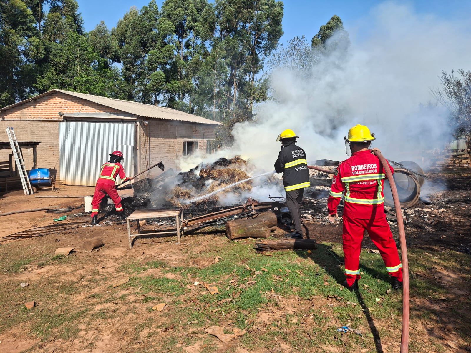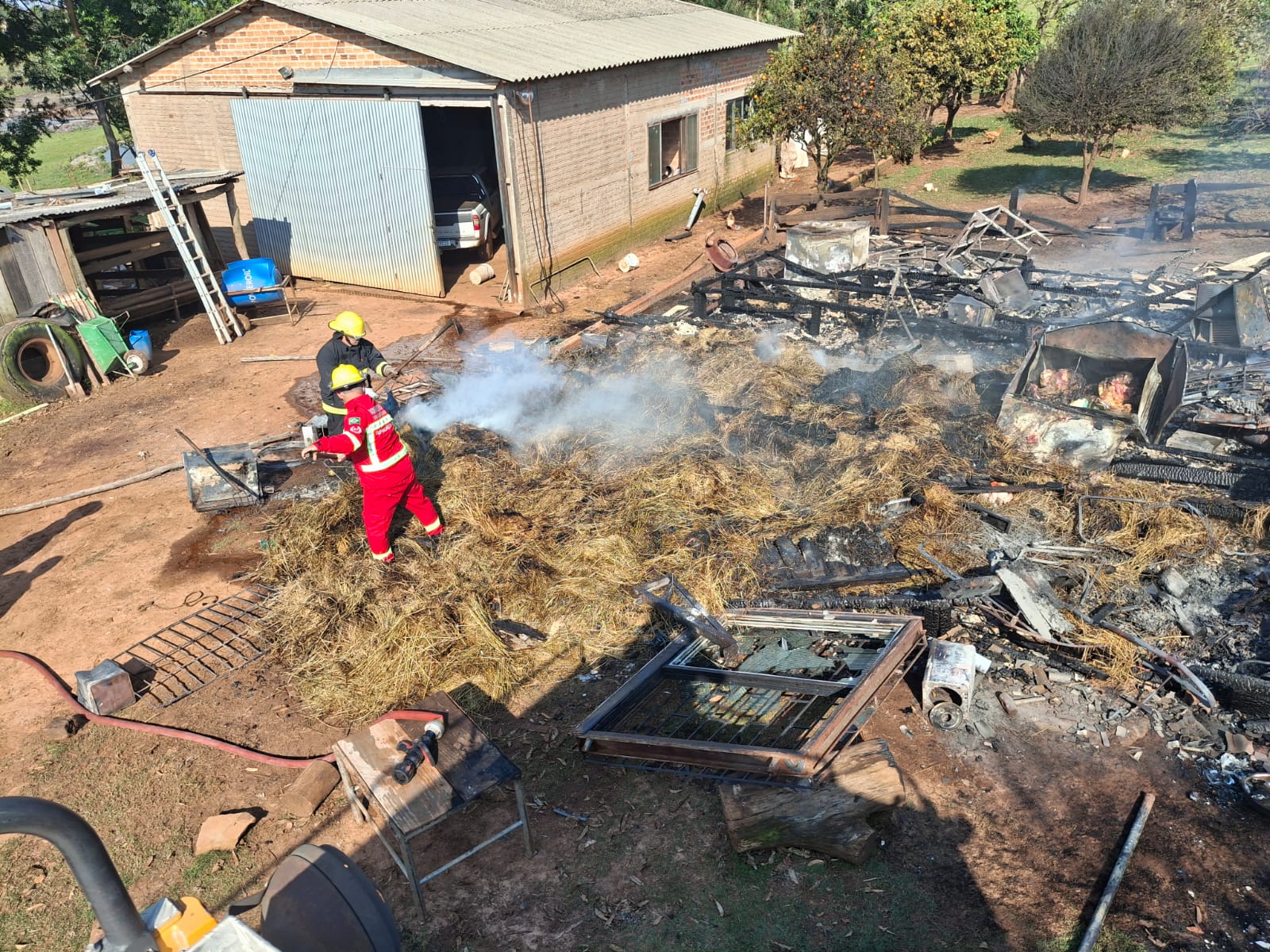 O galpão de 80 m², construído em madeira com telhado de amianto, abrigava equipamentos e suprimentos da família, que perdeu soldador, gerador, máquina de cortar carne, moedor de grãos, carro de mão, chocadeira, dois freezers com alimentos, utensílios rurais, materiais de pintura, além de 90 fardos de azevem seco, sacas de ração, milho e sal para animais e aves.