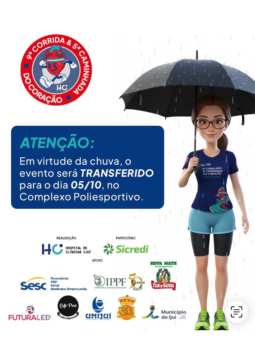 O Hospital de Clínicas de Ijuí transferiu para domingo, 05, a 9ª Corrida e 5ª Caminhada do Coração – especial 90 Anos do HCI. O evento estava marcado para ontem, 28, mas a data foi alterada em razão da instabilidade climática. A programação vai ocorrer no Complexo Poliesportivo de Ijuí. Haverá percursos de corrida de 5 km, caminhada ou corrida de 3 km e caminhada de 1 km. As inscrições já terminaram. Quem estiver inscrito e realizar a doação de um litro de leite para o programa Mesa Brasil, do Sesc, vai concorrer a camisetas do evento. E após a prova, durante a manhã do próximo domingo, no poliesportivo ijuiense haverá brinquedos infláveis para crianças e mateada com distribuição gratuita de erva-mate.