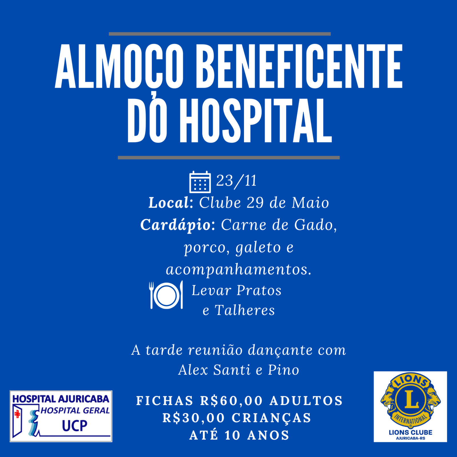 O Hospital Beneficente Ajuricaba (AHBA) realizará no domingo, 23, um almoço beneficente no Clube 29 de Maio, com objetivo de arrecadar recursos para auxiliar na manutenção da instituição. O evento é promovido pelo Lions Clube de Ajuricaba e contará com repertório musical à tarde, com apresentação de Alex Santi e Pino.