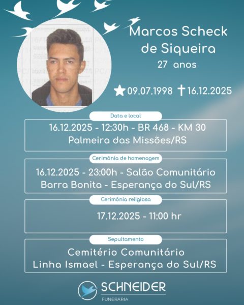 O condutor da motocicleta, identificado como Marcos Scheck de Siqueira, de 27 anos e natural de Esperança do Sul, morreu no local. A passageira do Fiesta sofreu ferimentos graves e foi encaminhada ao Hospital de Palmeira das Missões.