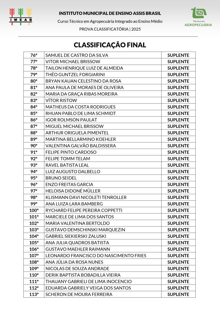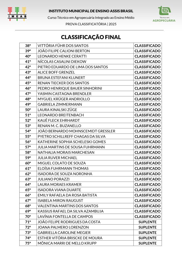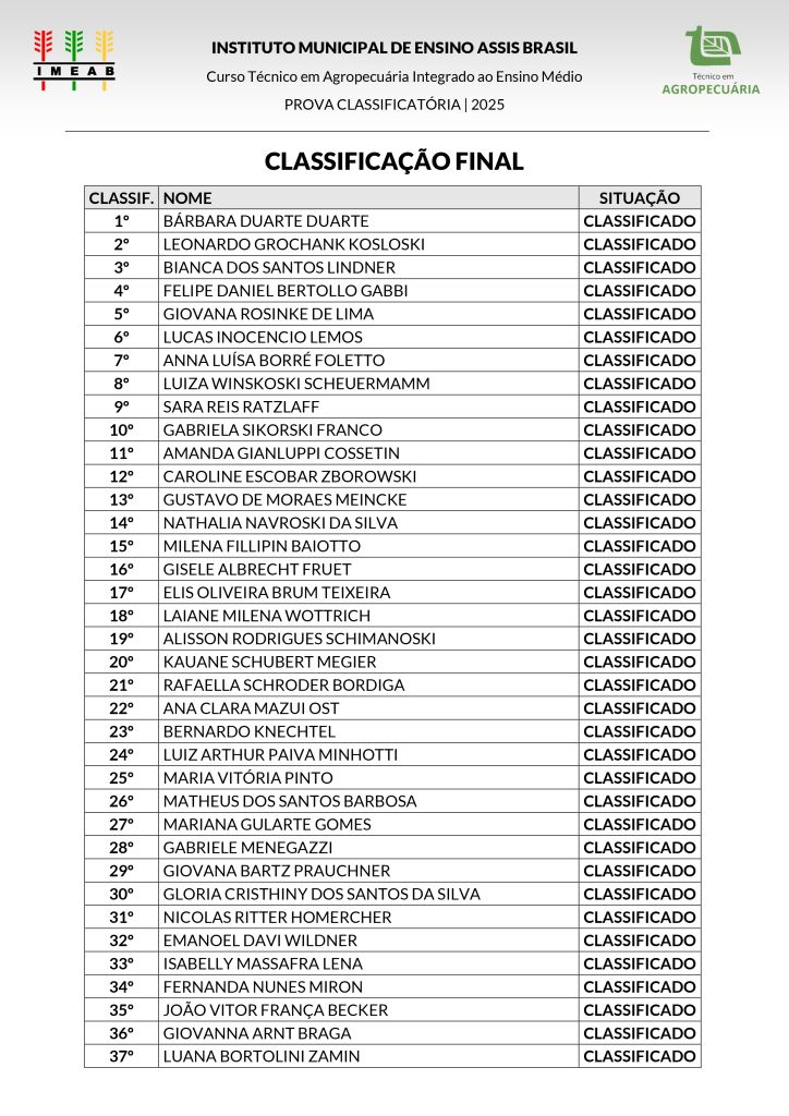 O Instituto Municipal de Ensino Assis Brasil de Ijuí, o Imeab, divulgou a classificação final dos candidatos ao Curso Técnico em Agropecuária Integrado ao Ensino Médio. As matrículas são realizadas de hoje até 30 de dezembro, mediante agendamento realizado pela secretaria da escola.