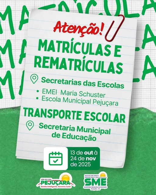 E também desta segunda-feira a 24 do próximo mês, em Pejuçara, haverá matrículas e rematrículas na rede municipal de ensino para 2026. O processo vai ser presencial nas secretarias da Escola Municipal de Educação Infantil Maria Schuster ou Próinfância e da Escola Municipal de Ensino Fundamental Pejuçara.