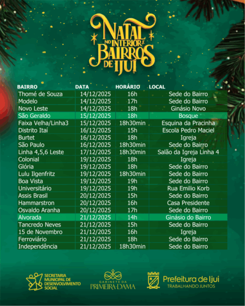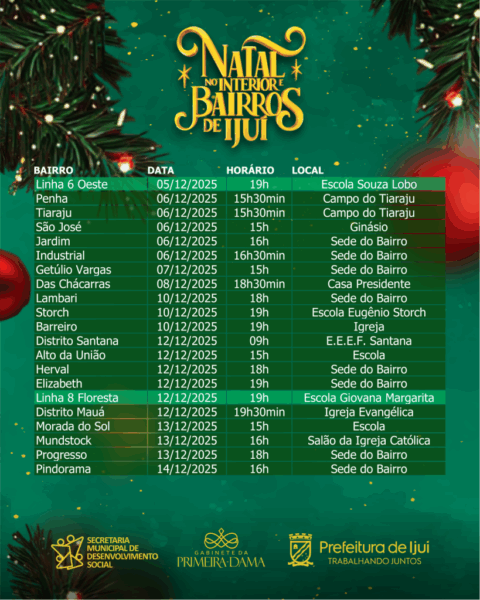 E hoje, começarão as festas de natal em comunidades do interior de Ijuí. As 19 horas desta sexta-feira, haverá programação na escola Souza Lobo, para crianças da Linha 6 Oeste. Podem participar crianças de 0 a 12 anos.