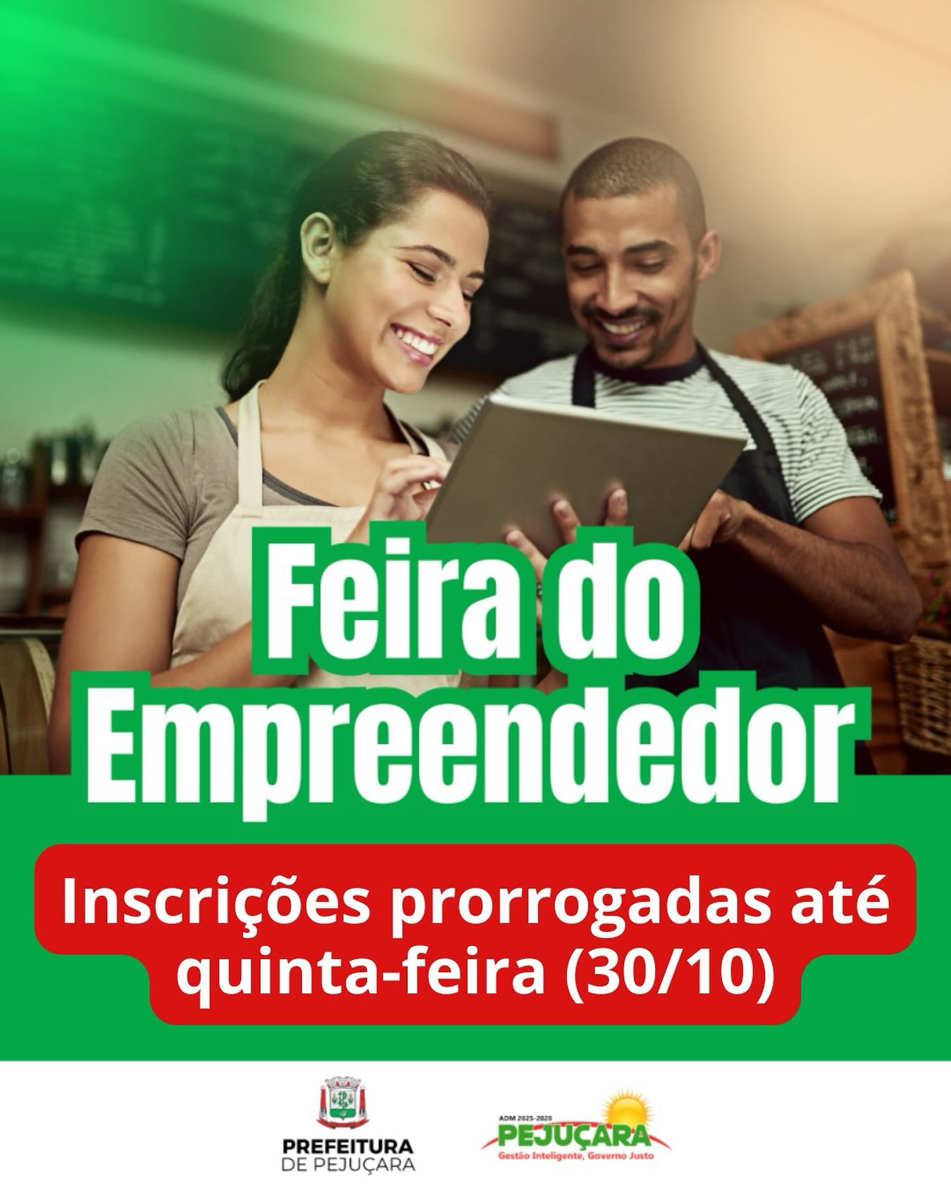 As inscrições para a Feira do Empreendedor deste ano em Pejuçara foram prorrogadas até amanhã, 30. Agroindústrias e comércio local devem se inscrever na Emater, ACI ou Sala do Empreendedor; artesanato, nos sindicatos Rural e dos Trabalhadores Rurais; e os escritores e talentos locais precisam comparecer na secretaria de Cultura, Turismo, Esporte e Eventos. A Feira do Empreendedor de Pejuçara, iniciativa da prefeitura, vai acontecer sábado, na praça Visconde de Rio Branco, com início as 8 horas e 30 minutos. Já das 14 às 17 horas, no mesmo local, haverá a Festa das Crianças, com brinquedos e atividades recreativas, também mateada e encontro de carros antigos.