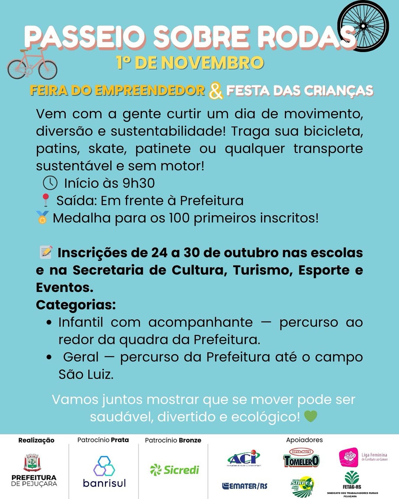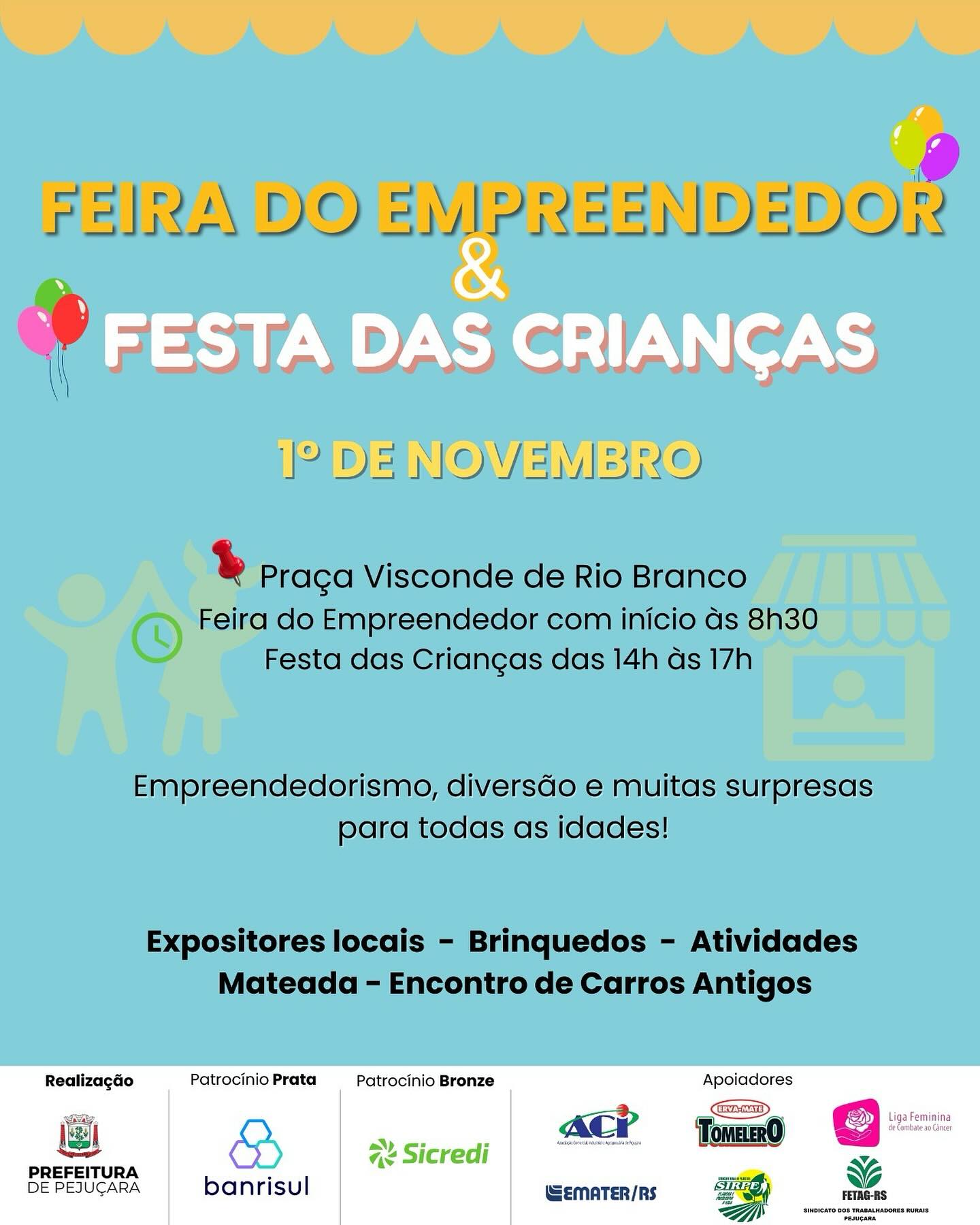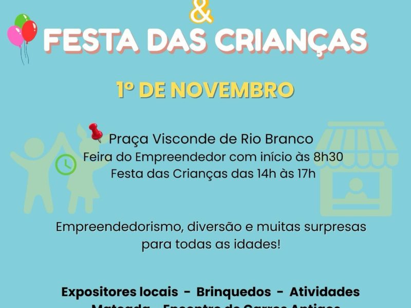 As inscrições para a Feira do Empreendedor deste ano em Pejuçara foram prorrogadas até amanhã, 30. Agroindústrias e comércio local devem se inscrever na Emater, ACI ou Sala do Empreendedor; artesanato, nos sindicatos Rural e dos Trabalhadores Rurais; e os escritores e talentos locais precisam comparecer na secretaria de Cultura, Turismo, Esporte e Eventos. A Feira do Empreendedor de Pejuçara, iniciativa da prefeitura, vai acontecer sábado, na praça Visconde de Rio Branco, com início as 8 horas e 30 minutos. Já das 14 às 17 horas, no mesmo local, haverá a Festa das Crianças, com brinquedos e atividades recreativas, também mateada e encontro de carros antigos.