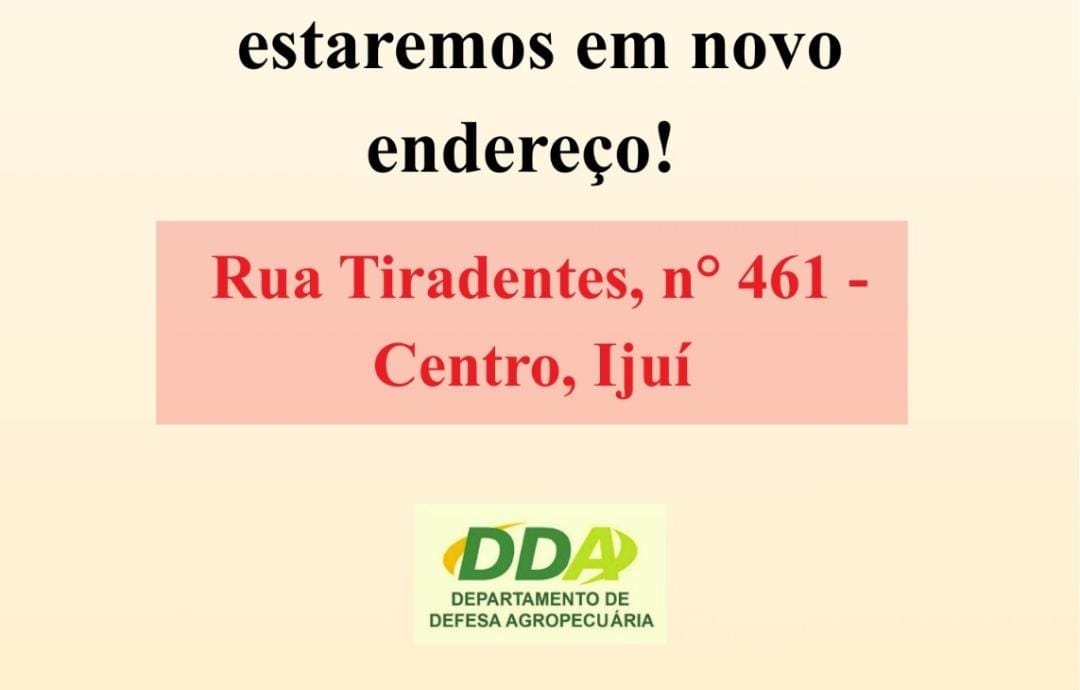 A Inspetoria Veterinária e Supervisão Regional de Ijuí antes localizada na Rua Ernesto Alves, no mesmo prédio do Sine mudará de endereço nesta sexta-feira, 16. A nova sede fica na Rua Tiradentes, nº 461, no Centro de Ijuí em frente a Nossa Terra Seguros e Imóveis. Atendimento das 08h às 11h30 e das 13h30 às 17h30.