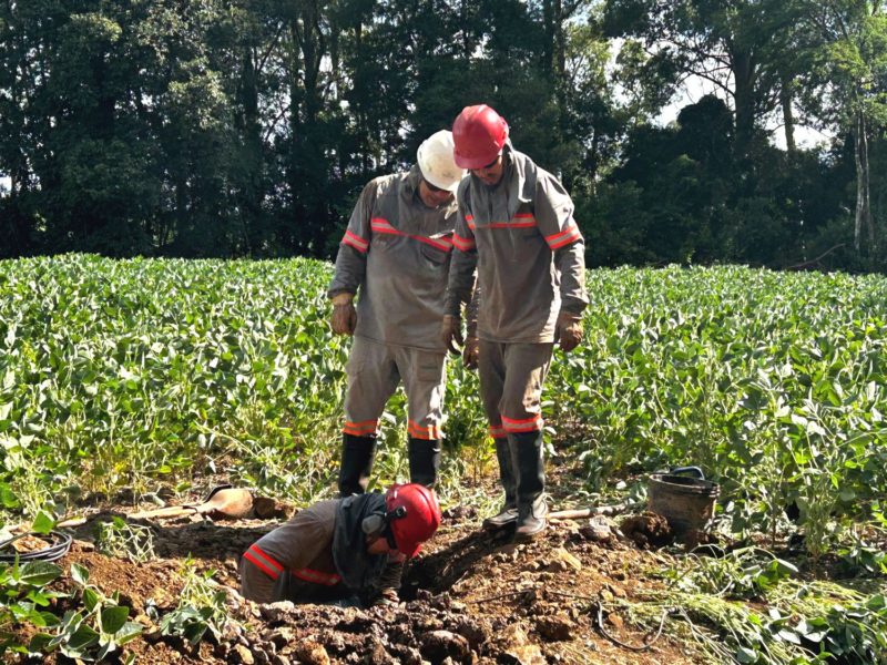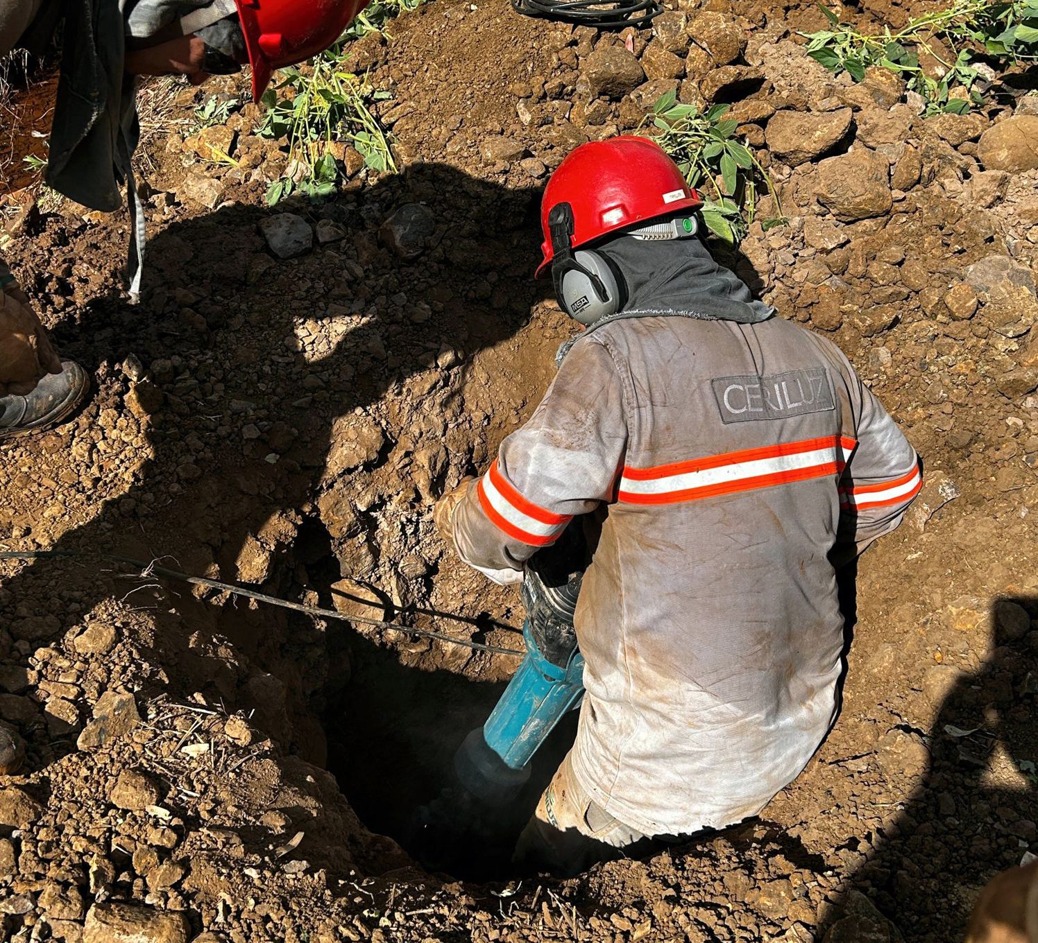 Quando a perfuração mecanizada não é possível, a Cooperativa adota medidas específicas. Em solos de rochas quebradiças, a escavação precisa ser manual. Para viabilizar a atividade, as equipes utilizam um rompedor elétrico, alimentado por gerador móvel, podendo ser usados mesmo nos locais mais distantes, além de pás e cavadeiras. A perfuração manual exige grande esforço físico por parte dos eletricistas da Cooperativa, não só pelo impacto da máquina na rocha, mas também pelas condições climáticas que podem se um agravante. E não é só a chuva que traz dificuldades. As altas temperaturas, registradas com frequência em nossa região no verão, também geram um grande desgaste aos colaboradores.