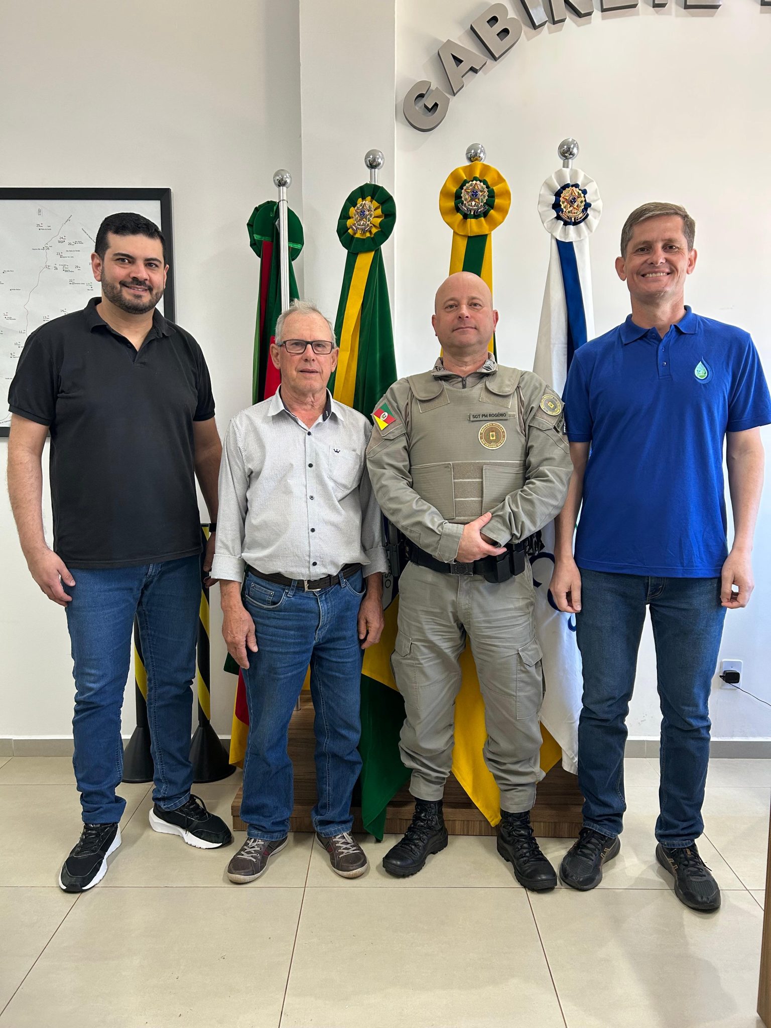 O município de Jóia dará mais um passo importante na área da segurança pública. Na manhã desta terça-feira,14, estiveram reunidos com o prefeito Dionei Lewandowski, o presidente do Sindicato Rural Pedrinho Patias, Comandante da BM local, Sargento Rogério Luis Rigoli e o Secretário Municipal de Administração José Soleni da Costa, Zé da Gaita, tratando sobre este assunto.