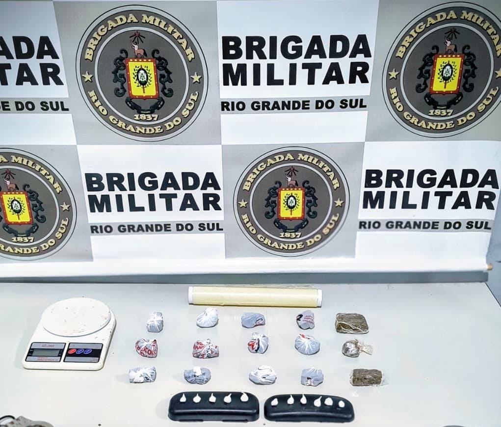 Durante o patrulhamento, o veículo foi identificado, acompanhado e abordado, sendo o condutor identificado como um homem de 18 anos, natural de Cruz Alta e sem antecedentes criminais. Com ele foram localizadas 8 porções de maconha (85g) e em diligências complementares mais 7 porções da mesma droga (97g) e 11 buchas de cocaína (3,3g), além de uma balança de precisão.