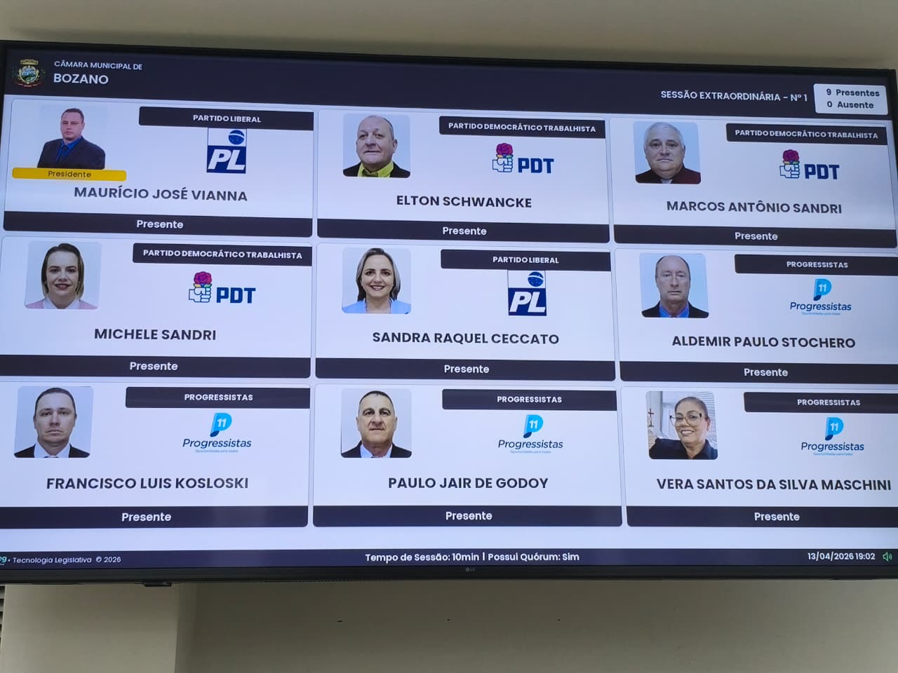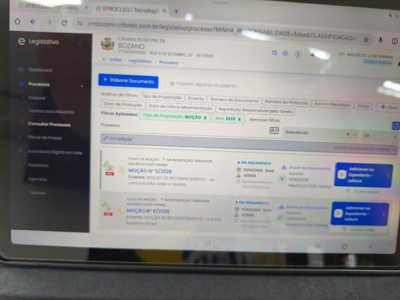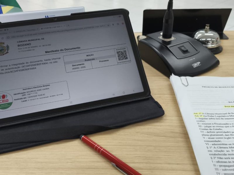 A Câmara de Vereadores de Bozano amplia o sistema de informatização. Na sessão semanal da última segunda-feira à noite, entrou em funcionamento um painel que identifica a votação dos vereadores, lista de pronunciamentos e tempo de participação. Além disso, cada vereador recebeu um tablet que proporciona votação eletrônica, acesso às pautas, dentre outras informações. O presidente do Legislativo bozanense, Maurício Vianna, do PL, durante entrevista ontem à noite no programa de Bozano, pela RPI, disse que essas medidas agilizam os processos na casa, trazem economia e melhoria no armazenamento de informações. (Abaixo, áudio de Maurício Vianna)