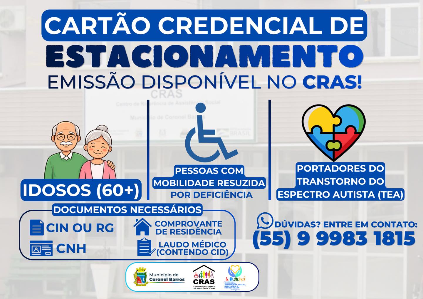 O cartão credencial de estacionamento em Coronel Barros pode ser solicitado no CRAS. O documento garante o uso de vagas especiais. O benefício é destinado para pessoas com 60 anos ou mais, ainda quem possui deficiência física, mobilidade reduzida e autistas. Interessados precisam apresentar RG ou CIN, CNH, comprovante de residência e laudo médico com CID.