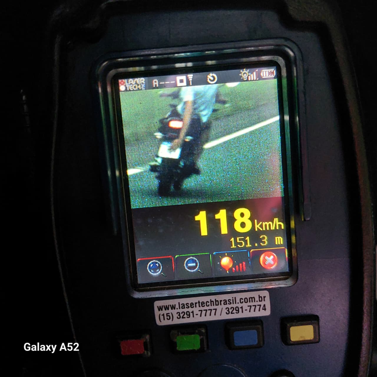 Durante operação com radar, a guarnição flagrou três motociclistas disputando corrida, realizando ultrapassagens em local proibido, trafegando na contramão e em manobras sobre a motocicleta. Uma das motos foi registrada a 118 km/h, com o condutor cobrindo a placa com a mão.