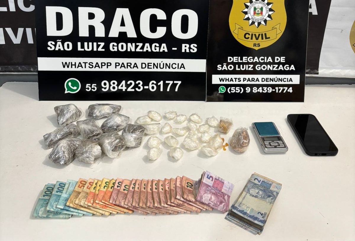 Foto: Polícia Civil - DRACO de São Luiz Gonzaga Uma mulher foi presa em flagrante por tráfico de drogas em São Luiz Gonzaga, durante ação conjunta da DRACO e da Delegacia de Polícia do município, com a apreensão de maconha, cocaína, crack, dinheiro e materiais utilizados para a comercialização dos entorpecentes.