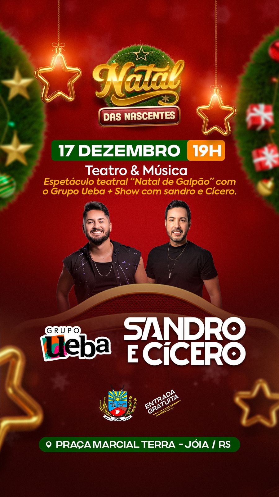 O público poderá prestigiar o espetáculo teatral “Natal de Galpão”, apresentado pelo Grupo Ueba, trazendo ao palco uma encenação que resgata tradições, emoção e o verdadeiro espírito natalino. Na sequência, a animação musical fica por conta do show com a dupla Sandro e Cícero, garantindo momentos de confraternização e alegria para toda a família.