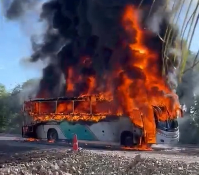 Ônibus com funcionários de fábrica agrícola pega fogo e bloqueia a BR-386,em Soledade