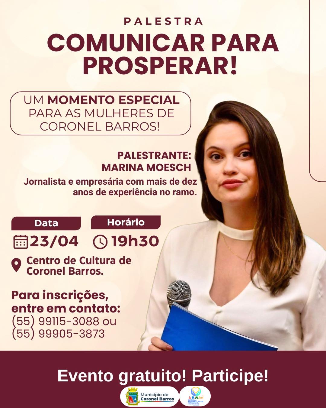 O Centro Municipal de Cultura de Coronel Barros vai receber, nesta quinta-feira, a palestra “Comunicar para Prosperar”, ministrada pela jornalista Marina Moesch. O evento, voltado ao público feminino, tem como foco o desenvolvimento pessoal e profissional através da qualificação da comunicação e da imagem.