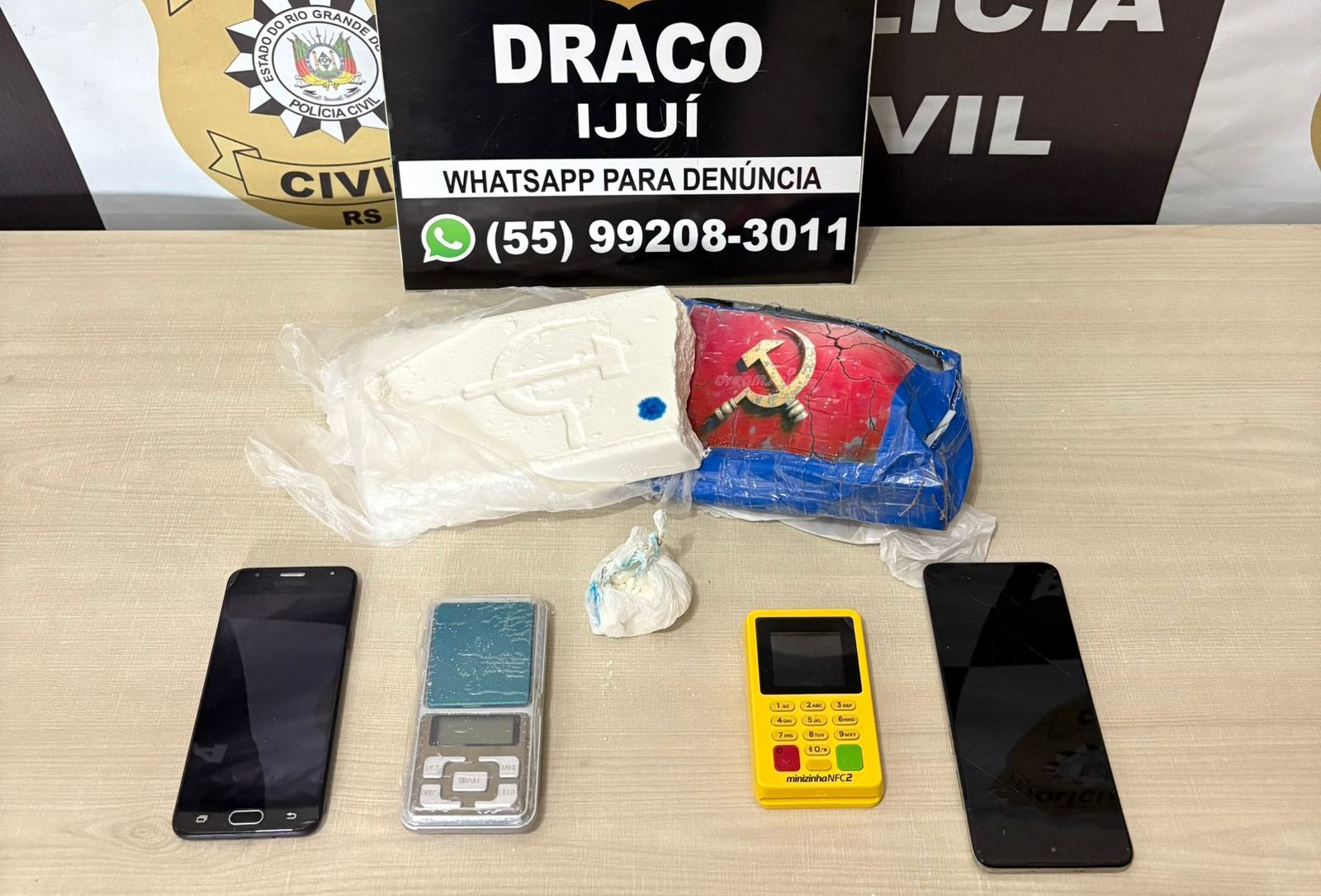 A Polícia Civil de Ijuí prendeu, ontem à tarde, um homem, de 40 anos, acusado de tráfico de drogas. Policiais cumpriram mandado de busca e apreensão, expedido pelo Judiciário de Ijuí, a partir de investigação da DRACO local. Numa residência no bairro Thomé de Souza, houve apreensão, em posse do investigado, de uma porção de 27 gramas de cocaína, ainda uma balança de precisão. Na ocasião, o homem foi detido em flagrante e encaminhado ao sistema prisional. Já na tarde de hoje, em novas diligências em uma chácara utilizada pelo mesmo indivíduo, foi localizado ocultado em um mato um tijolo de cocaína, total de 865 gramas. Com as ações, a estimativa é de prejuízo de cerca de 100 mil reais ao tráfico de drogas em Ijuí.