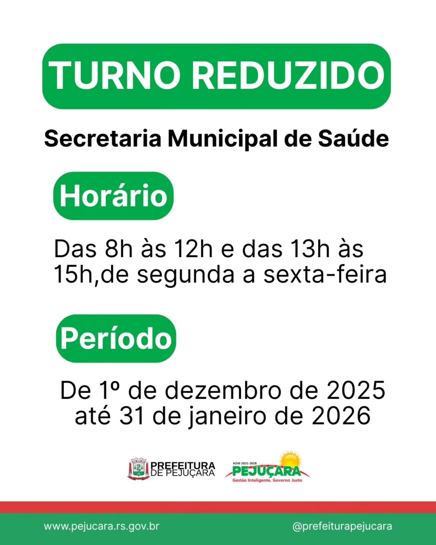 Já a secretaria de Saúde de Pejuçara passará a atender em turno reduzido a partir do dia 1º de dezembro, com funcionamento das 8 às 12 e das 13 às 15 horas. O turno único da maiorias das repartições municipais de Pejuçara e o turno reduzido da secretaria de Saúde, vão ter vigência até o dia 31 de janeiro de 2026.