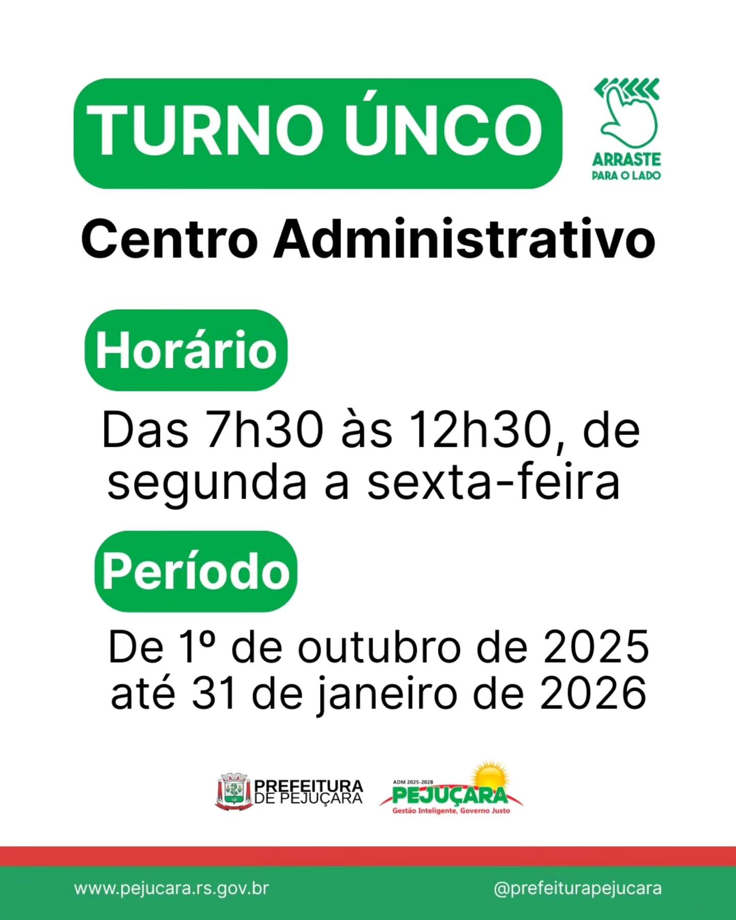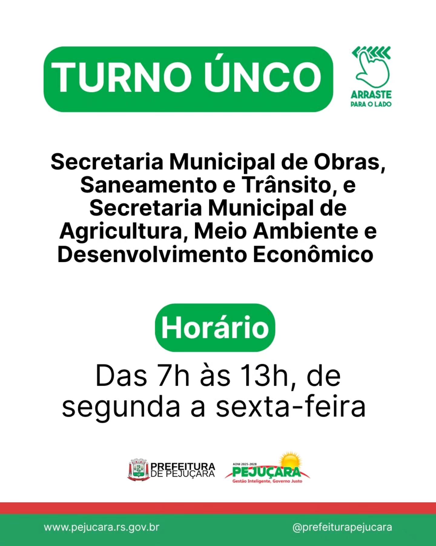 A partir desta quarta-feira, 01, a prefeitura de Pejuçara passa a atender em turno único. O Centro Administrativo estará aberto das 7 horas e 30 minutos às 12 e 30, de segunda a sexta-feira. As secretarias de Obras, Saneamento e Trânsito, e de Agricultura e Meio Ambiente, no entanto, vão atuar das 7 às 13.