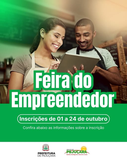 A prefeitura de Pejuçara vai realizar a Feira do Empreendedor, dia primeiro de novembro. Interessados em participar podem se inscrever até dia 24 deste mês. Agroindústrias e comércio local precisam se inscrever na Emater, ACI ou Sala do Empreendedor.