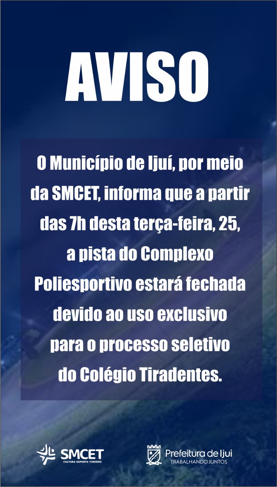 Nesta terça-feira, 25, a partir das 7 horas da manhã, a pista do complexo poliesportivo de Ijuí, ao lado do ginasião municipal, vai estar fechada. Nesta terça-feira, o local vai ficar para uso exclusivo da seleção de alunos da escola militar Tiradentes ao próximo ano.