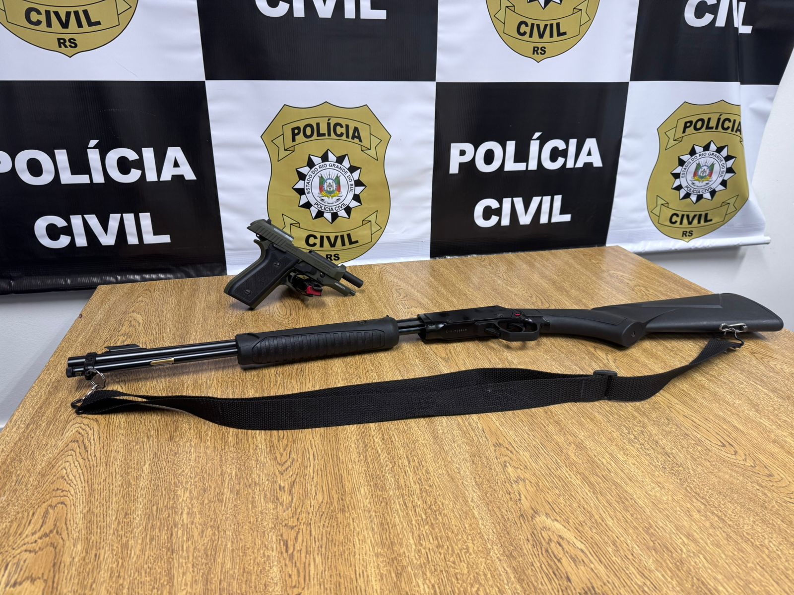 Foram recolhidas uma pistola calibre .380, em São Luiz Gonzaga, e um rifle calibre .22, em São Nicolau. As armas estavam registradas, mas foram apreendidas por determinação judicial como medida de proteção no âmbito de investigação relacionada à violência doméstica.