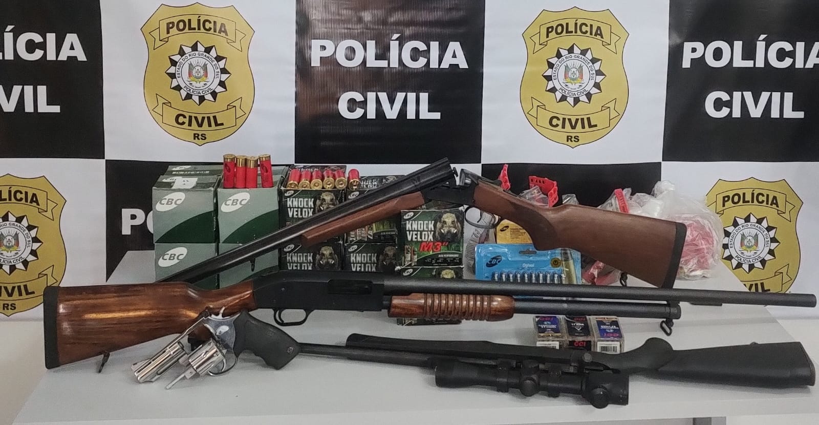 A Delegacia de Polícia de Proteção a Grupos Vulneráveis (DPPGV) de São Luiz Gonzaga apreendeu quatro armas de fogo e farta munição durante o cumprimento de dois mandados de busca nesta quinta-feira (26). A operação, que contou com o apoio do Setor de Investigações local, resultou na localização de três espingardas e um revólver.