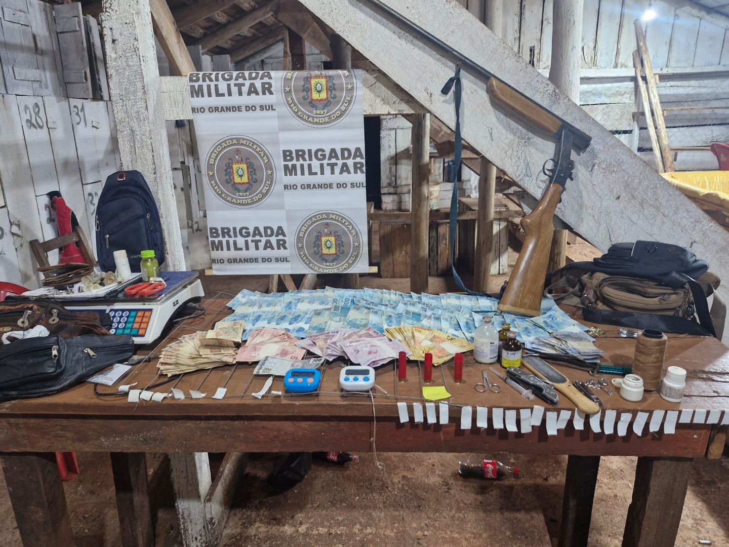 Numa ação, ontem à noite, a Brigada Militar de Santo Augusto e a Cia Ambiental de Santa Rosa, prenderam 15 pessoas durante rinha de galo no interior de Santo Augusto. As detenções ocorreram por maus-tratos animais e posse irregular de arma de fogo de uso permitido. A rinha de galo era realizada num galpão. No local havia vários carros e pessoas, porém, na chegada das equipes vários indivíduos correram em direção a uma mata. Foi possível abordar 15 pessoas e apreender vários objetos da prática ilícita. Houve apreensão, por exemplo, de uma espingarda, cartuchos, balança de precisão, 11 mil, 569 reais, 27 sacolas de transporte, caderno de anotações, 88 esporas plásticas, ainda materiais diversos para manuseio de animais, como seringas, remédios veterinários, biqueiras de aço e esporas.