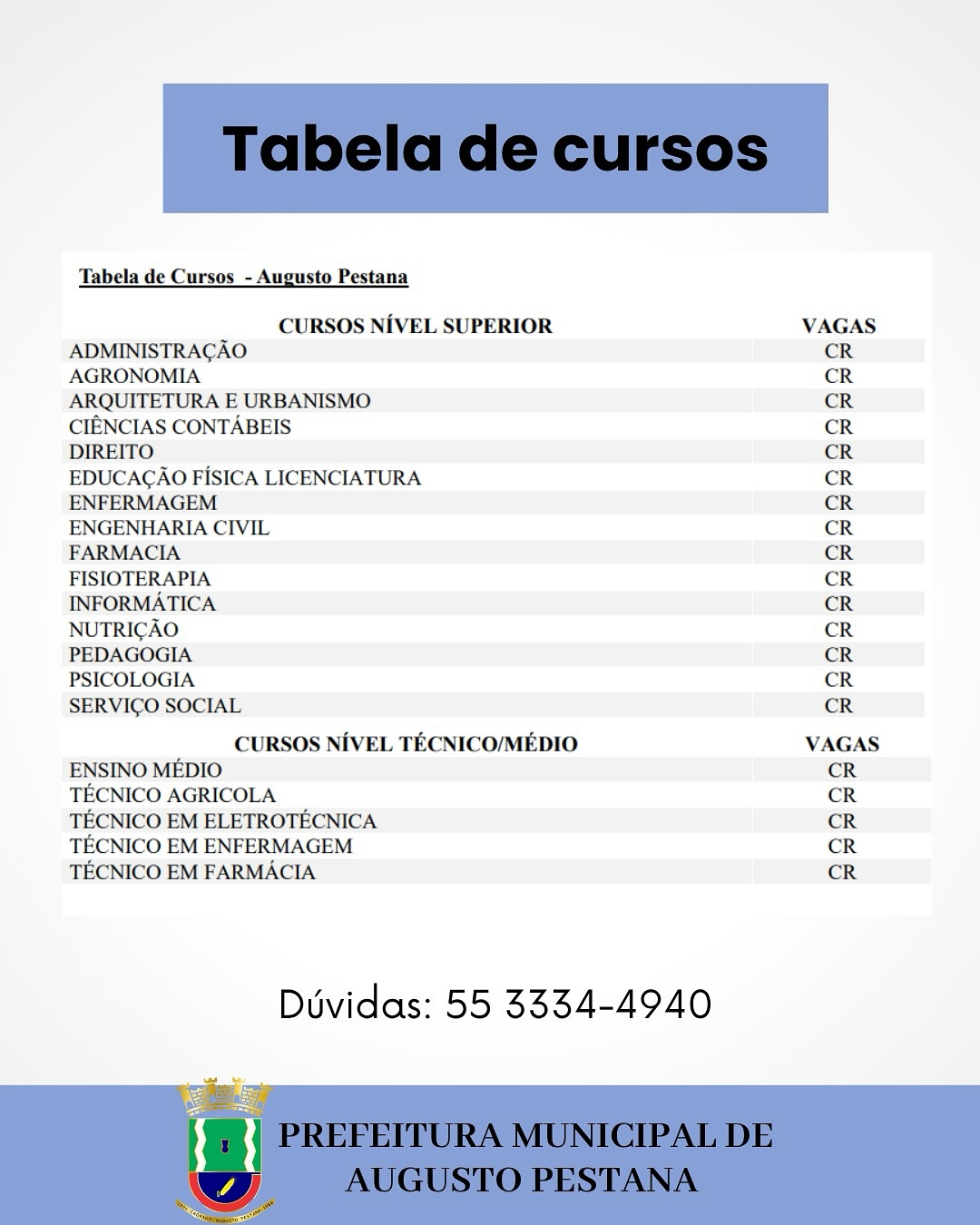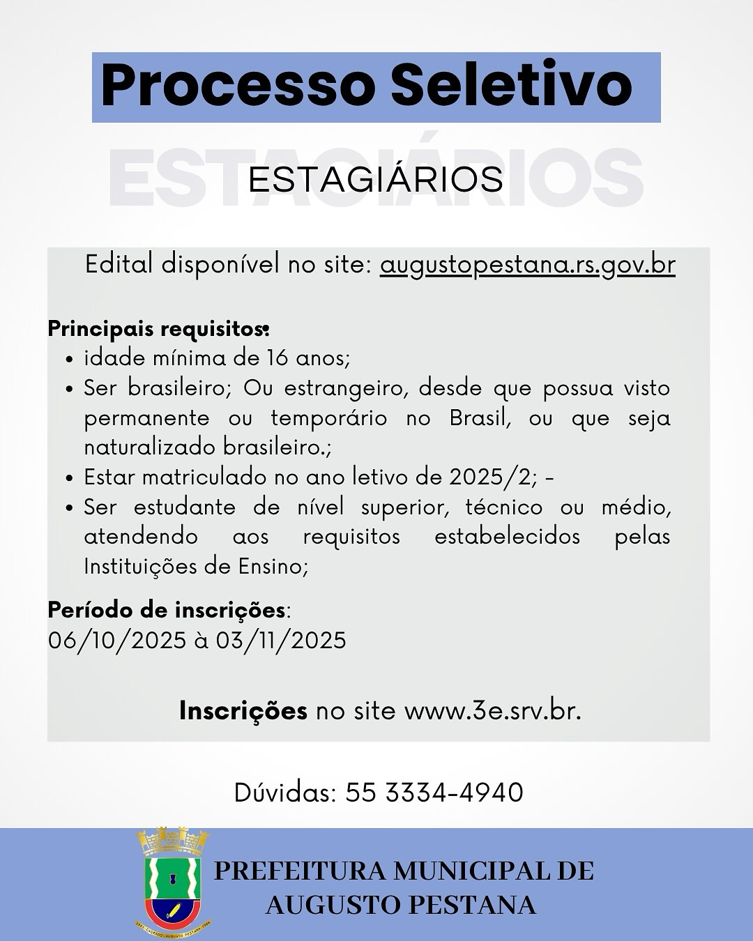 A prefeitura de Augusto Pestana vai realizar nova seleção de estagiários. Inscrições até 3 de novembro pelo site www.3e.srv.br. O edital está disponível em augustopestana.rs.gov.br. Os candidatos precisam ter idade mínima de 16 anos, estarem matriculados nesse ano letivo e serem estudantes dos níveis superior, médio ou técnico.
