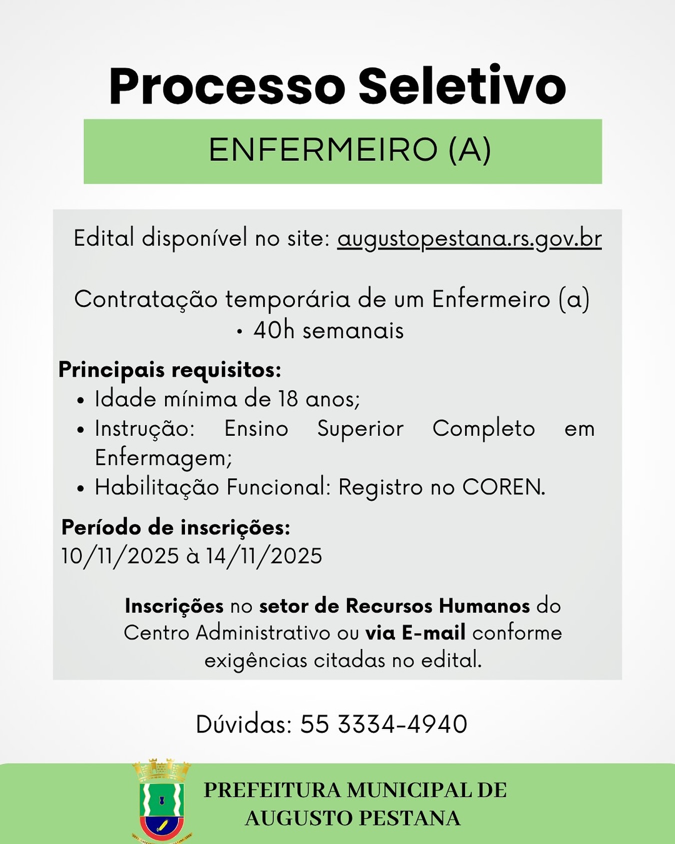De hoje até sexta-feira, a prefeitura de Augusto Pestana recebe inscrições para seleção temporária de enfermeiro. A carga horária de trabalho é de 40 horas semanais, com período de seis meses e possibilidade de prorrogação por igual período. O vencimento é de 5 mil, 210 reais. As inscrições devem ser realizadas no Setor de Recursos Humanos da prefeitura ou através do e-mail [email protected].